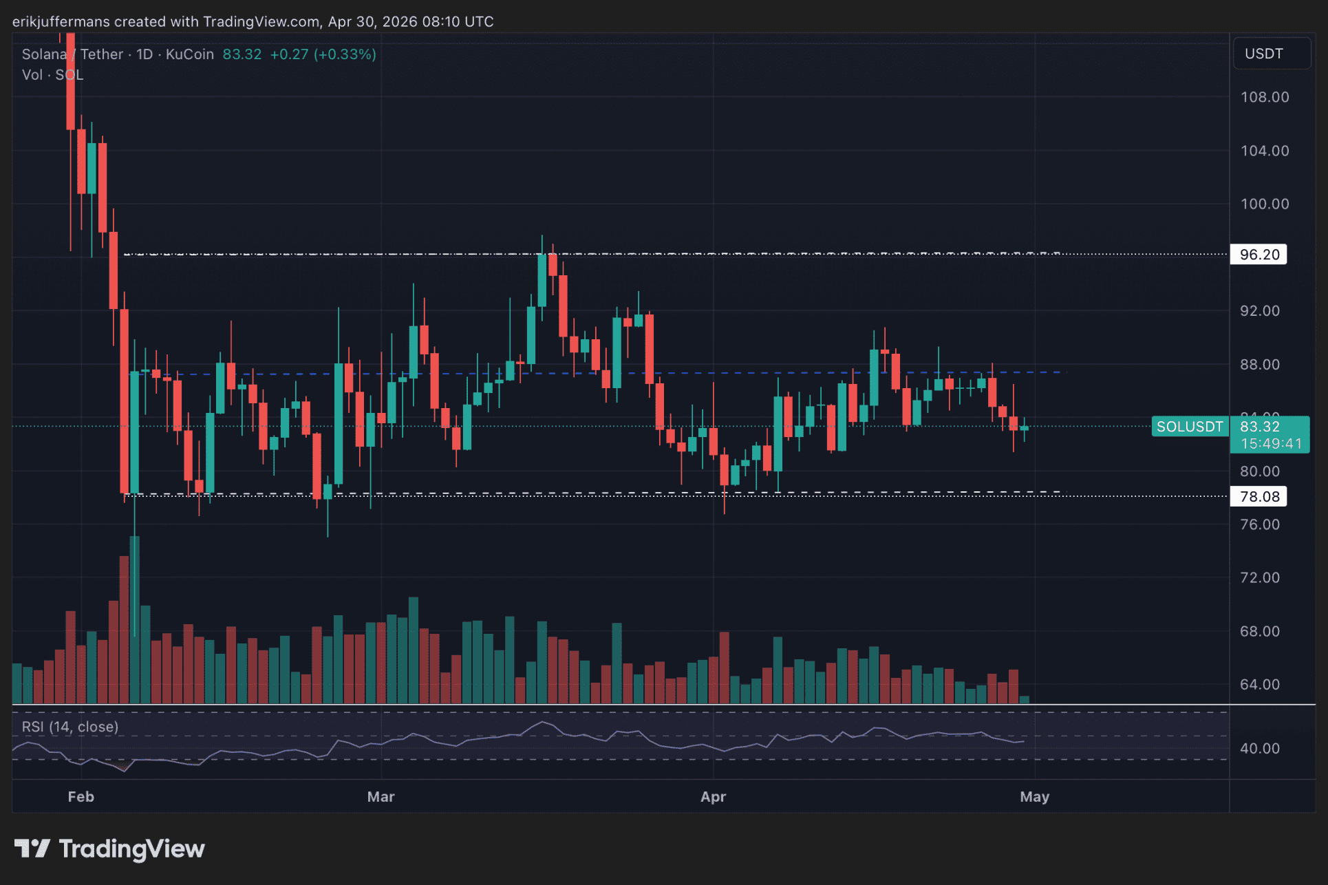 Wie in der unten stehenden Tagesgrafik zu sehen ist, bewegt sich $SOL seit Monaten in einer Spanne zwischen 78 und 96 Dollar. Aktuell handelt $SOL näher an der Untergrenze als an der Obergrenze.