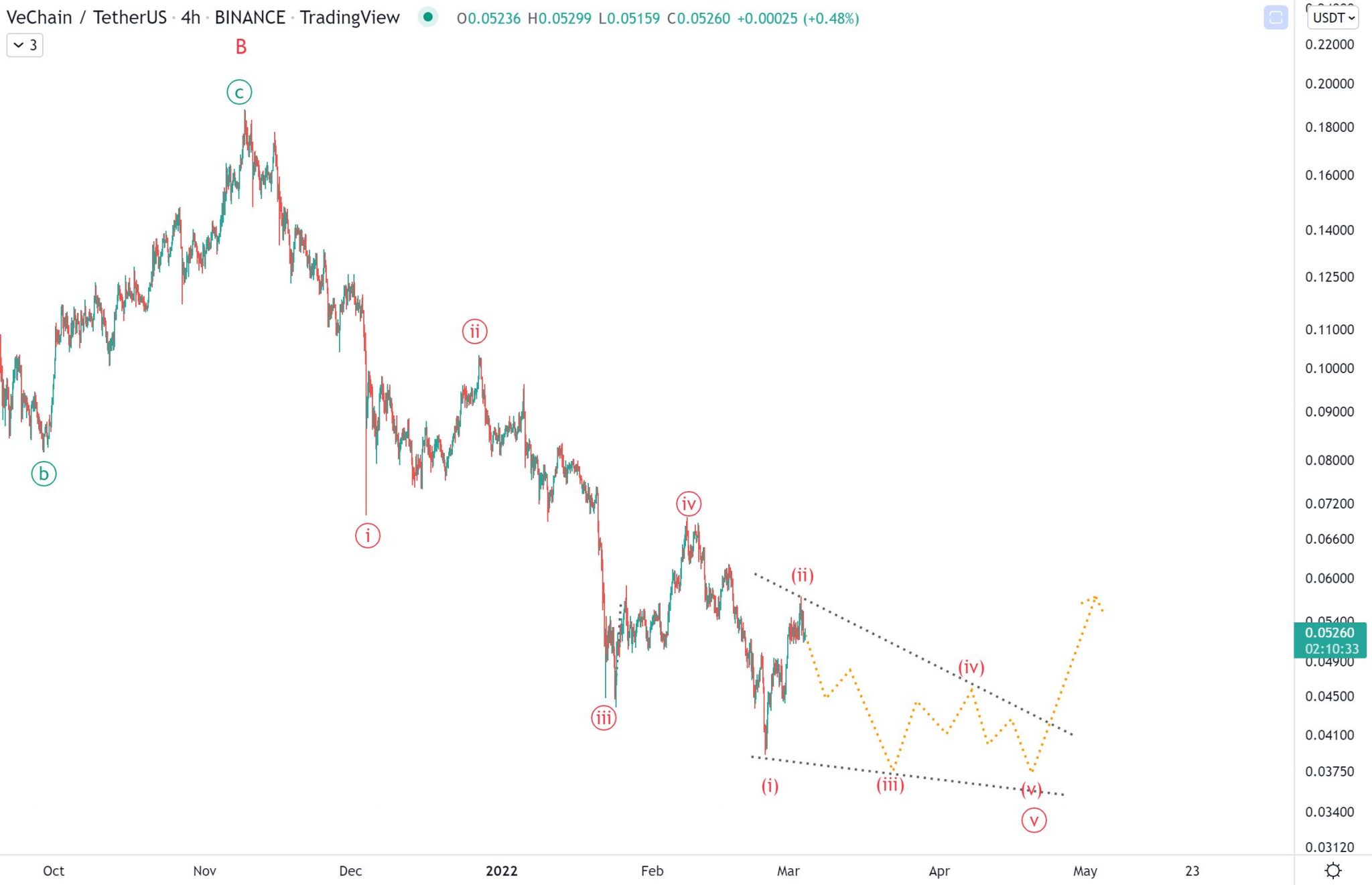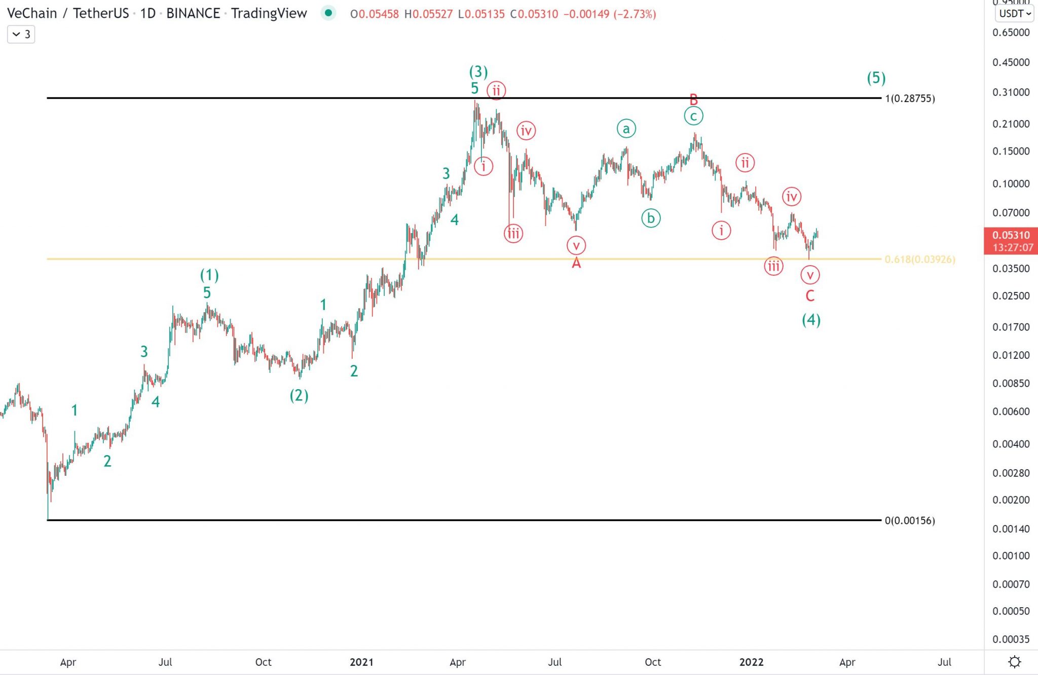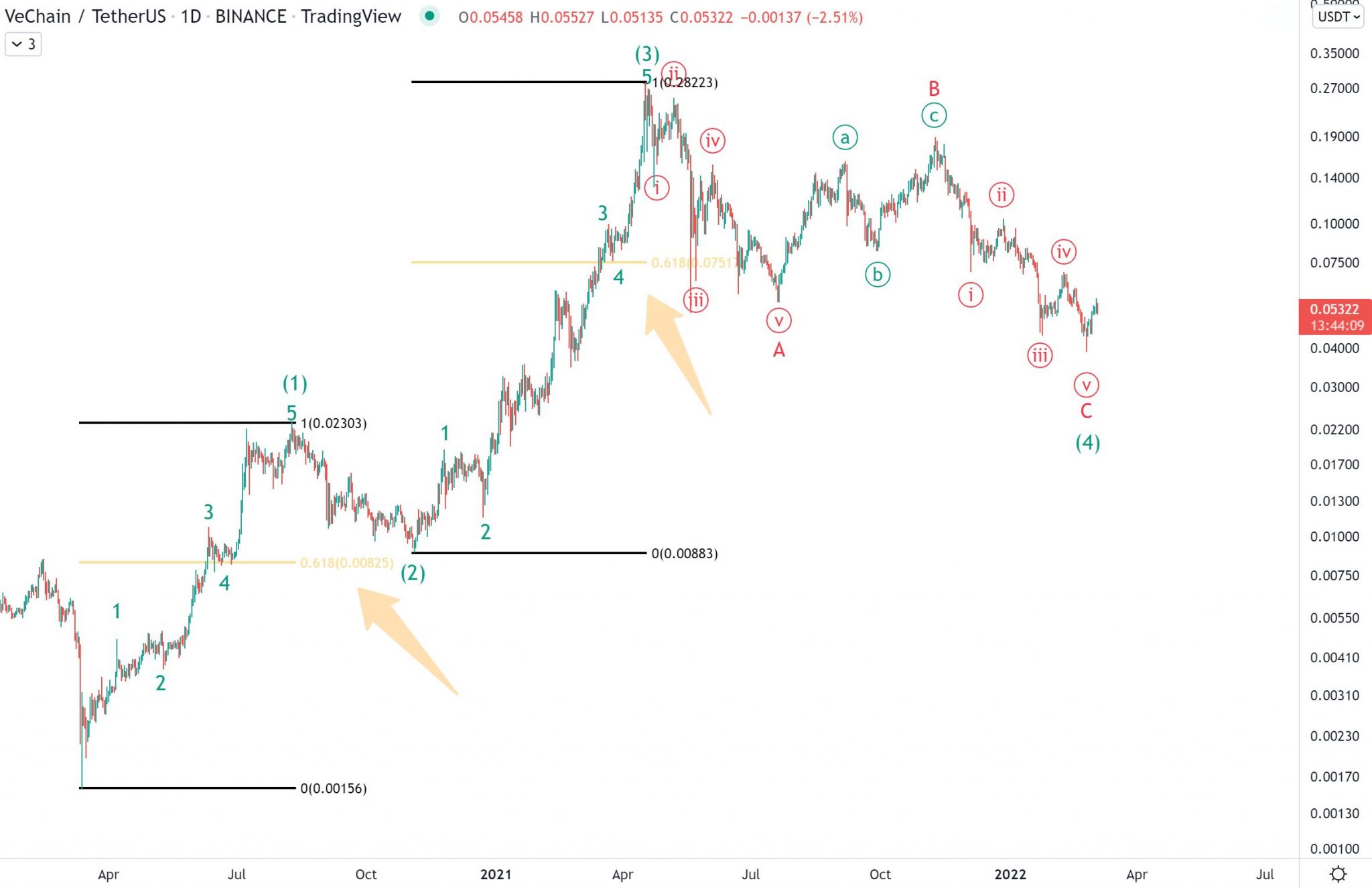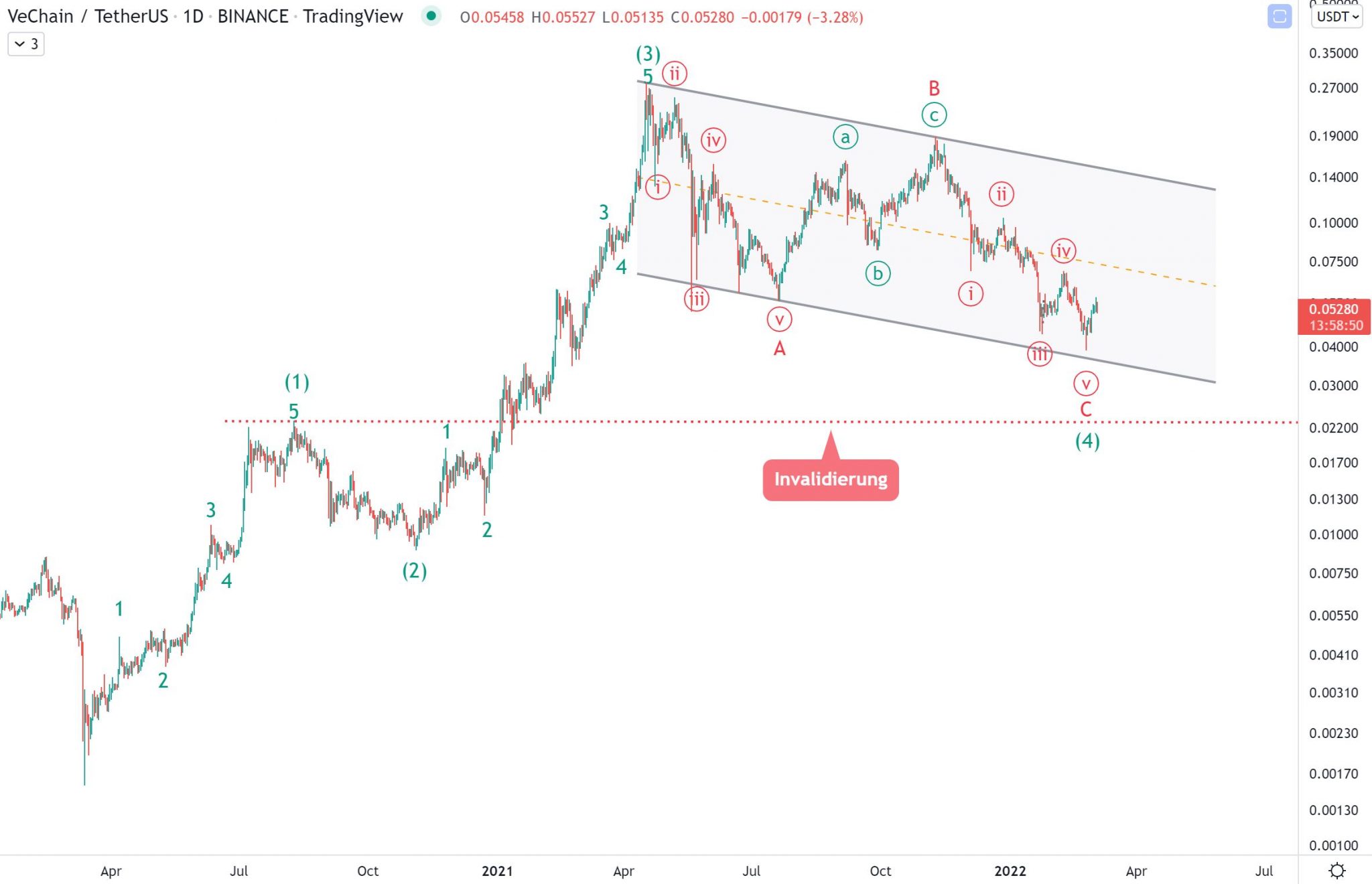 Wir können festhalten, dass der VeChain Kurs eventuell bereits seinen Boden in einer Welle (4) ausgebildet hat oder kurz davor steht.