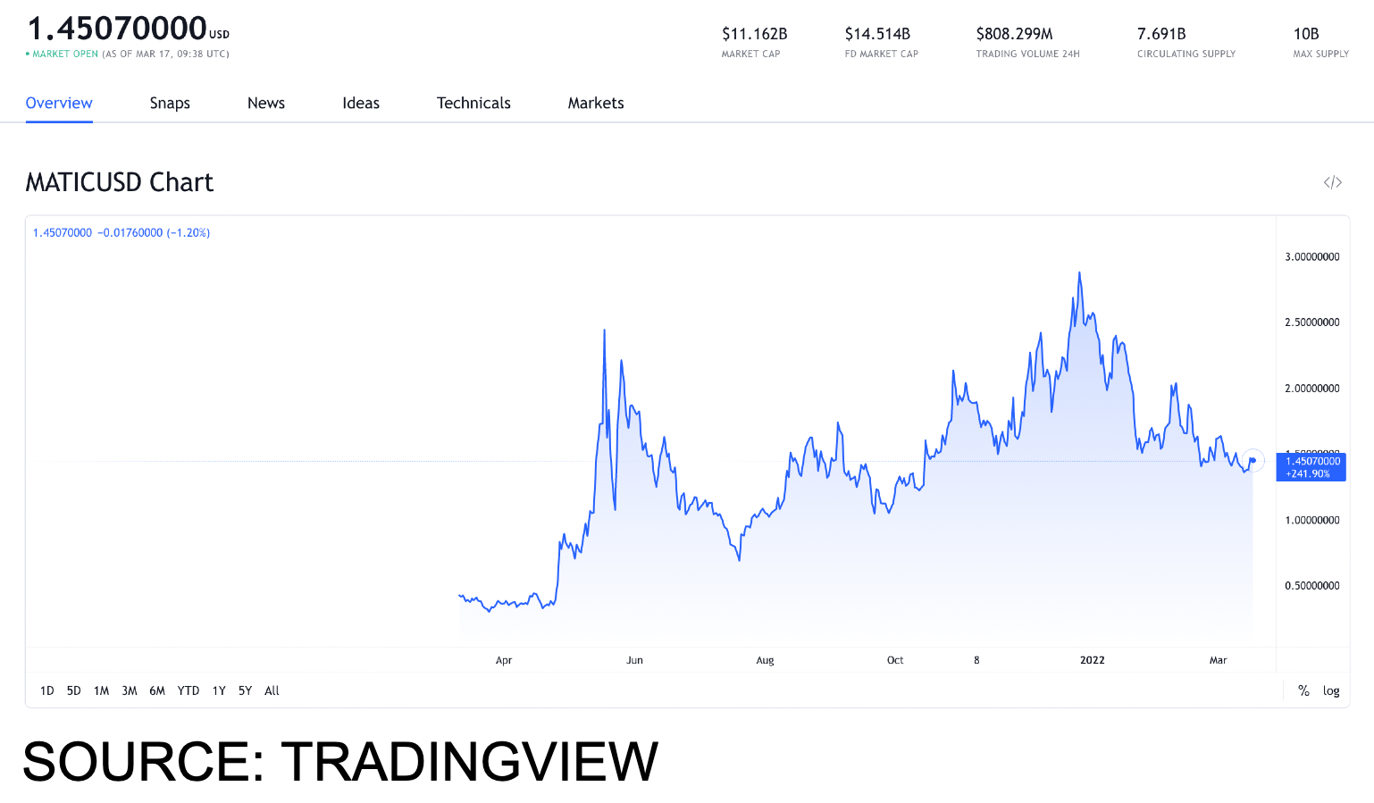 Am 17. März 2022 hatte Polygon (MATIC) einen Wert von 1,45 USD.