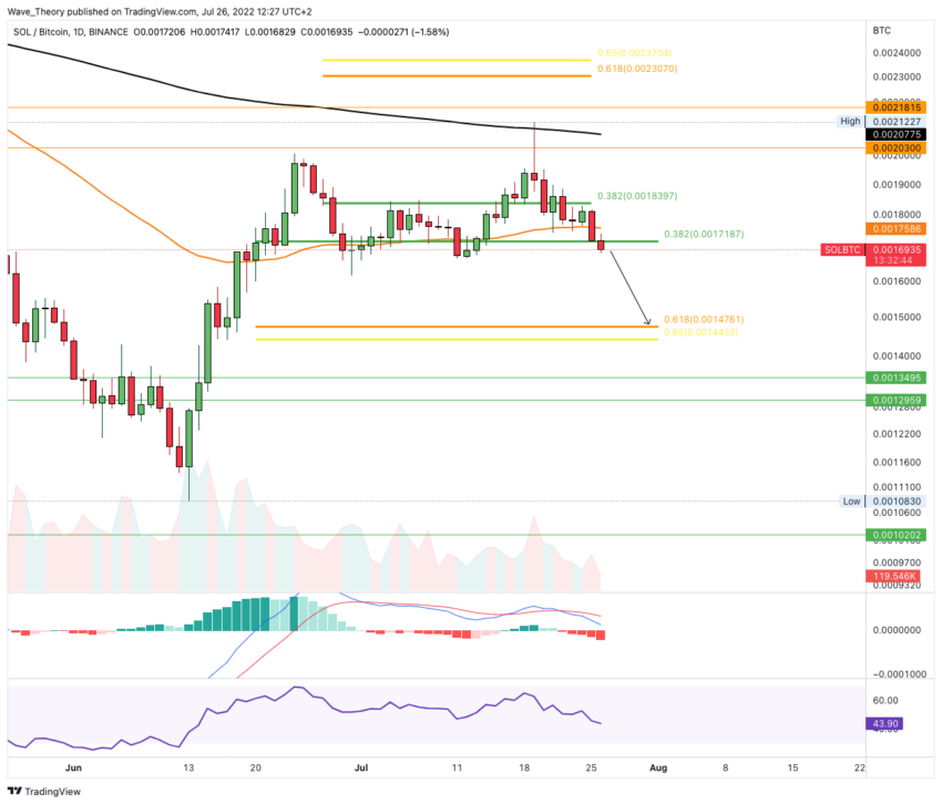 Aktuell scheint Solana die 0,382 Fib Unterstützung bei rund 0,00172 BTC bärisch zu durchbrechen, womit Solana zur Golden Ratio bei rund 0,00145 BTC zurückkehren könnte.