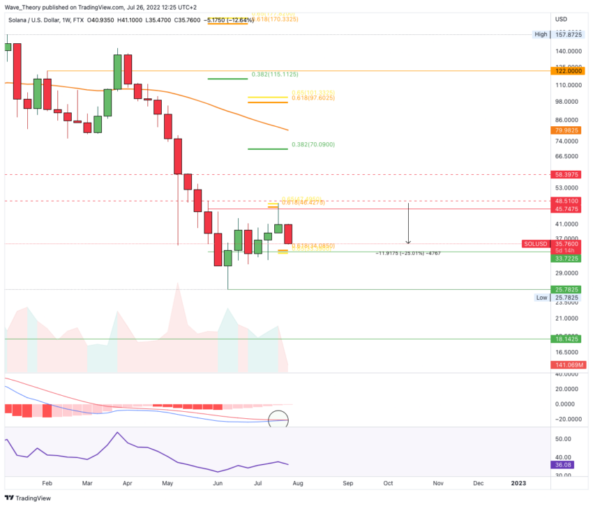 Der Solana Kurs konnte rund 85 % steigen, seit Solana den lokalen Tiefpunkt bei rund 26 USD erreicht hatte. Jedoch wurde Solana jetzt sehr stark an dem Golden Ratio Widerstand bei rund 47,5 USD abgewiesen. Damit bleibt eine bullische Kerzenformation im Monatschart weit entfernt, denn dafür müsste der Solana Kurs zum Monatswechsel über 45,75 USD stehen.