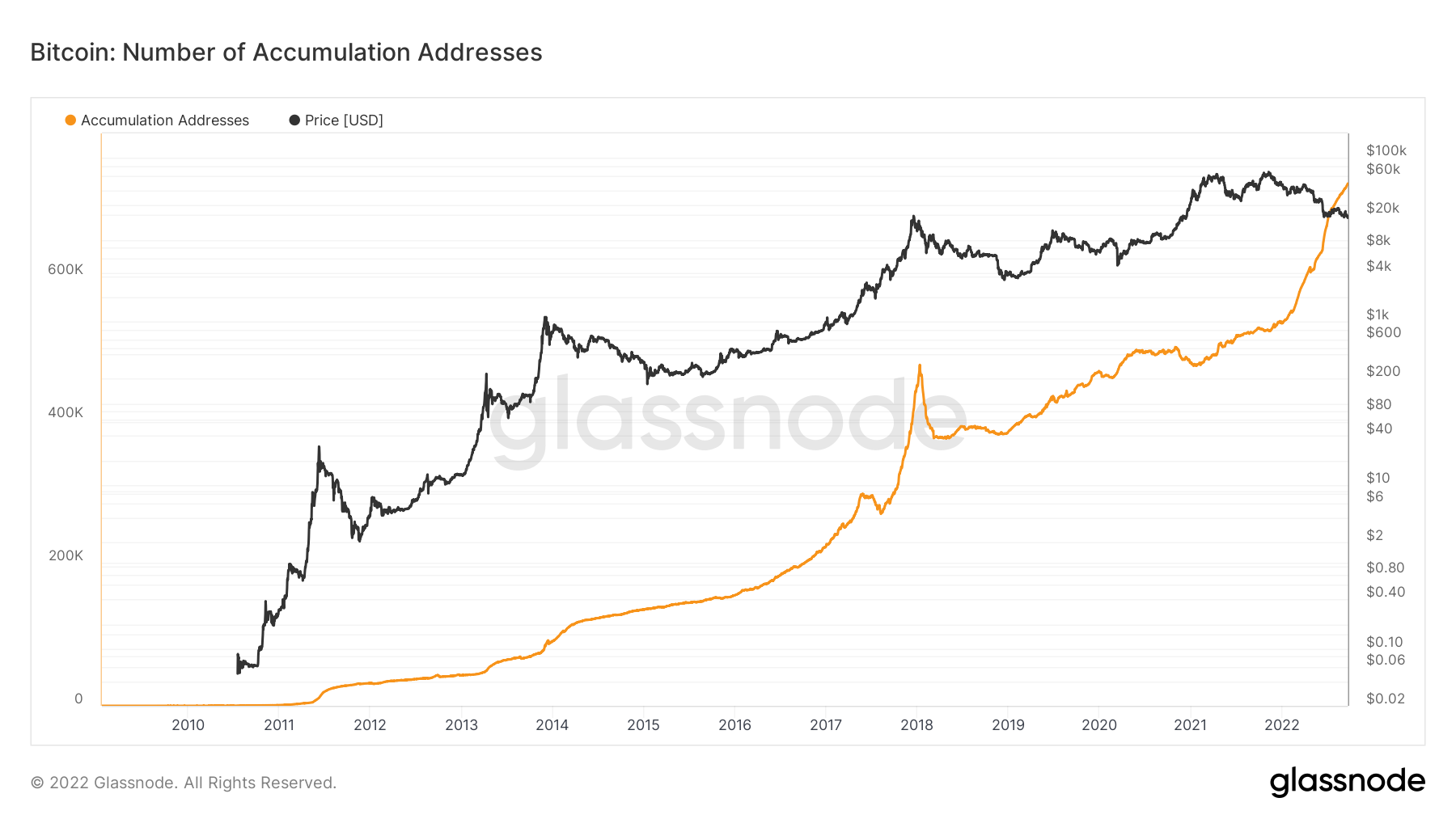 Die Anzahl der Adressen, die ankaufen ist unterdessen trotz Bärenmarkt konstant auf dem Vormarsch, wie die Daten zeigen. Dabei werden diejenigen Adressen erfasst, die „mindestens zwei eingehende Transaktionen aufweisen und keine Ausgaben verzeichnen“.