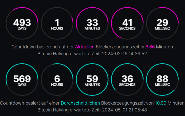 Steigt die Hashrate, also die Rechenleistung des Netzwerks, werden neue Blöcke schneller validiert. Das Problem: Letzte Woche kam es bei Block 757.214 zu einem neuen Allzeithoch von in der Spitze 321.15 Exahashes pro Sekunde (EH/s). Dadurch wurde die durchschnittliche Blockzeit unterschritten. Laut Berechnungen von Bitcoinsensus.com lag die Dauer sodann bei 7,65 Minuten/Block. Demnach hatte sich auch das Halvingevent auf den 19. Dezember 2023 verschoben.