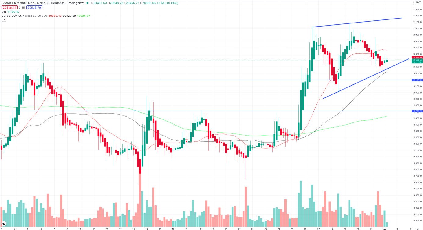 Für deutliche Kursimpulse konnte das Jubiläum jedoch nicht sorgen. In den vergangenen 24 Stunden lief der Bitcoin leicht seitwärts. Nach der jüngsten Rallye gab es erste Rückgänge auf rund 20.500 $. Auf diesem Kursniveau macht sich BTC für eine potenzielle Jahresendrallye bereit? Unsere Bitcoin Kurs Prognose: