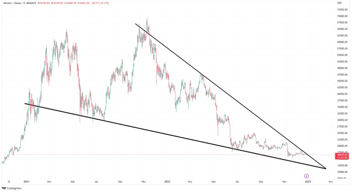 Was ist also in 2023 vom Bitcoin-Preis zu erwarten? Die technische Chartanalyse zeigt, dass sich der Bitcoin Kurs weiter innerhalb eines fallenden Keil befindet. Dabei handelt es sich um ein bullisches Muster, bei dem ein Breakout nach oben wahrscheinlicher ist. Bisher ist es BTC/USD jedoch nicht gelungen, die abfallende Widerstandslinie zu durchbrechen, die sich aktuell bei rund 17.000 Dollar befindet.