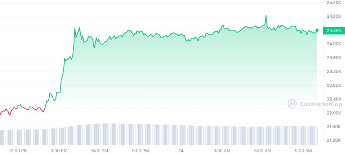 War das der endgültige Befreiungsschlag? Nachdem er geraume Zeit ziellos zwischen 19.630 und 22.000 Dollar hin- und hergependelt ist, konnte sich Bitcoin (BTC) gestern endlich spektakulär aus seiner fixen Range befreien: Bullen trieben die Kryptowährung Nummer 1 von 22.025 Dollar aus innerhalb weniger Stunden zunächst auf 24.478 Dollar, dann im weiteren Tagesverlauf sogar auf bis zu 24.822 Dollar – ein Anstieg von 12,69%, und das an nur einem Tag (Daten von Coinmarketcap.com)!