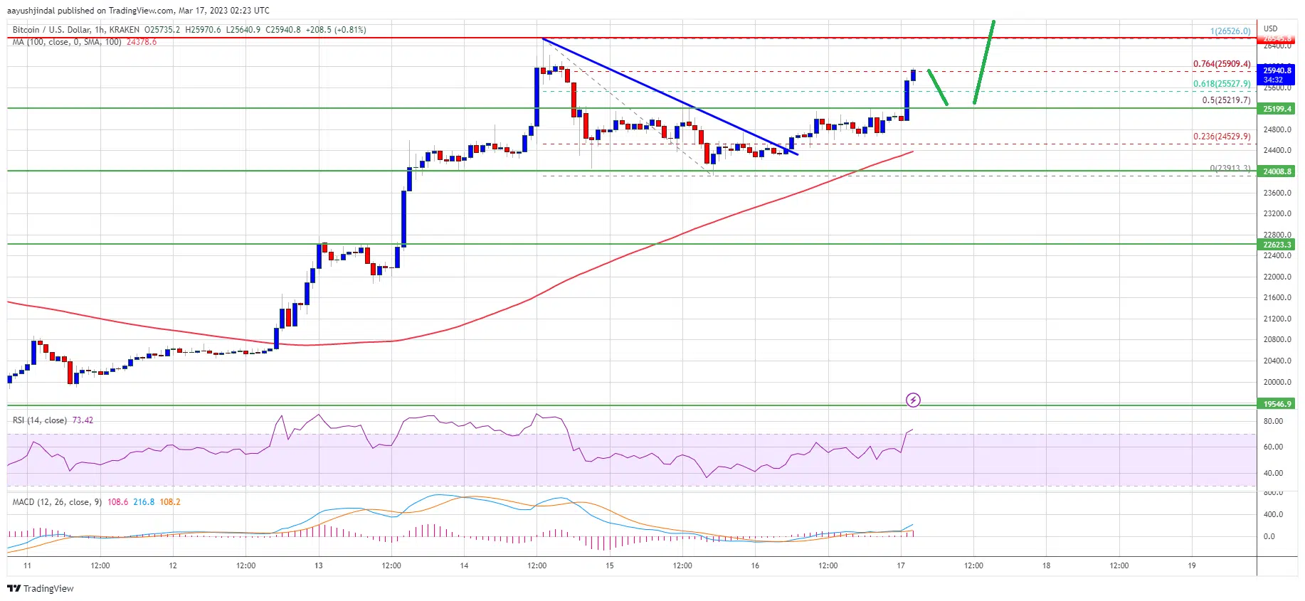 Bei 23.913 Dollar bildete sich ein Tiefpunkt, und der Preis begann einen neuen Anstieg. Im Anschluss konnte sich Bitcoin deutlich über die Widerstandszone von 24.500 Dollar bewegen. Der Kurs überwand sogar das 50%-Fib-Retracement-Niveau der Abwärtsbewegung vom Hoch bei 26.525 Dollar bis zum Tief bei 23.913 Dollar.
