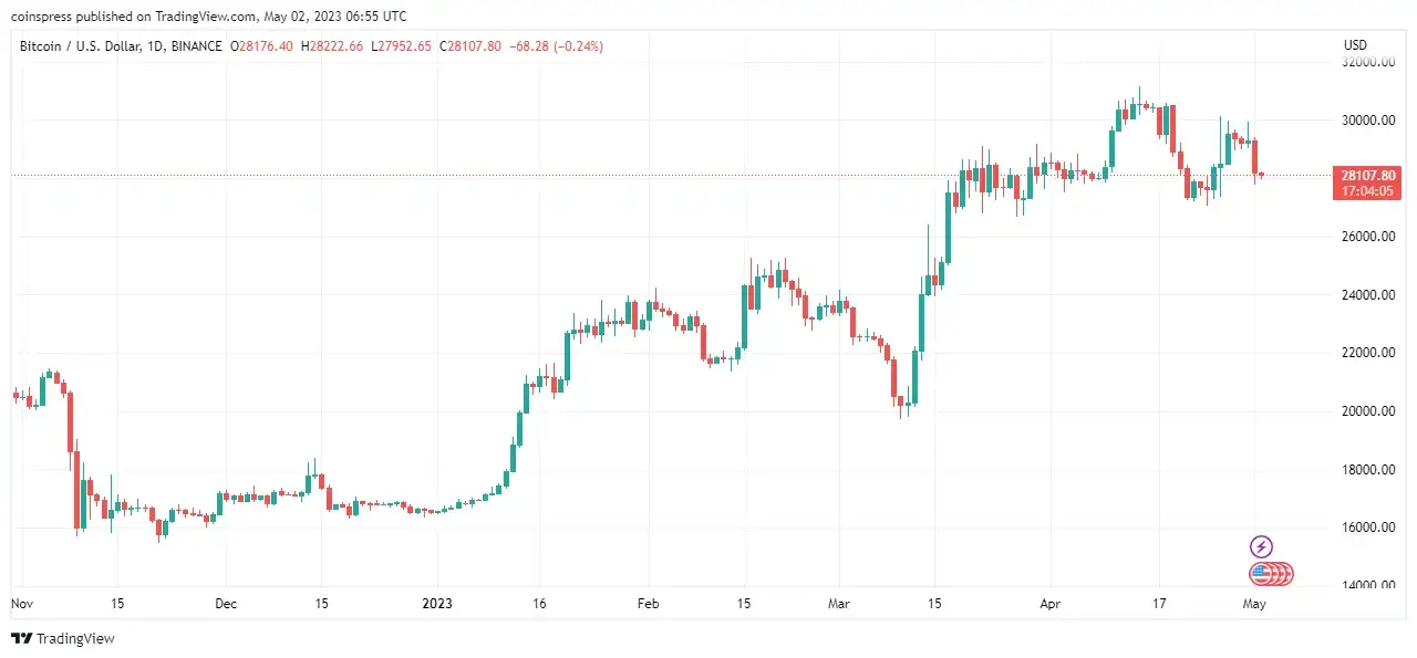 Was die jüngste Preisbewegung betrifft, so stieg Bitcoin am 25. April zunächst von $27,400 an und erreichte einen Widerstandspunkt von $29,260 , den er über das Wochenende zu durchbrechen versuchte. Der Wert von Bitcoin erreichte in der vergangenen Woche dreimal die Marke von $29,800, ist jetzt aber auf etwa $28,100 gefallen.