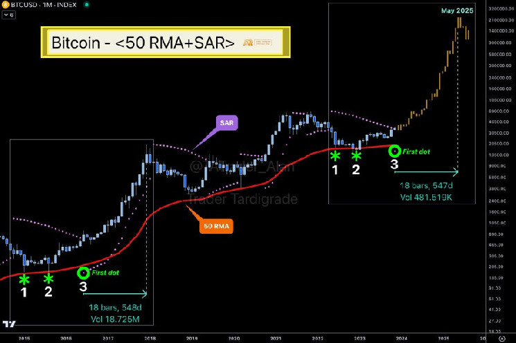 Tatsächlich hat Bitcoin die gleiche doppelte Unterstützung durch den 50-Perioden-RMA (Relative Moving Average) auf seinem Monatschart gefunden, zusätzlich zu seinem parabolischen Stop-and-Reverse (SAR), der den ersten Punkt druckt, wie von Kryptowährungsexperten beobachtet Händler Bärtierchen, veröffentlicht in einem X-Beitrag am 27.11.