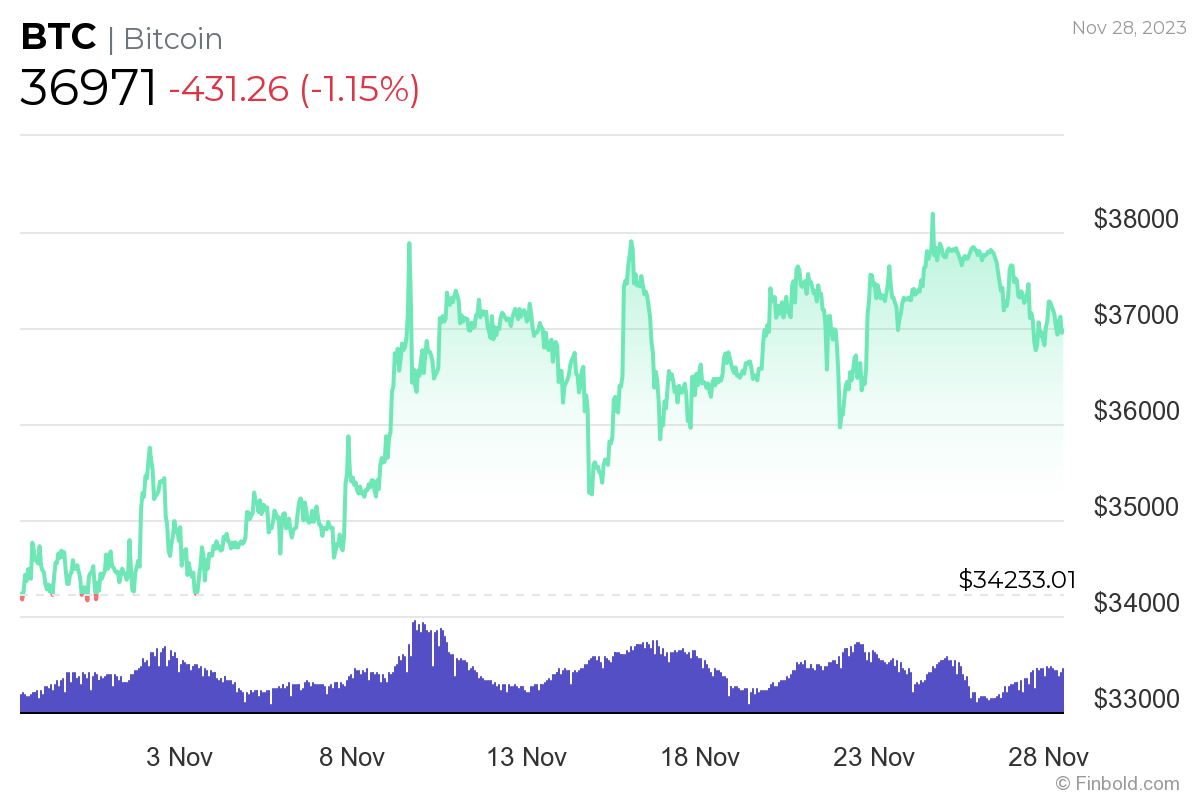 Unterdessen wurde Bitcoin bei Redaktionsschluss bei 36.971 US-Dollar gehandelt, was einem Rückgang von 1,15 % in den letzten 24 Stunden und einem Rückgang von 1,26 % in den letzten sieben Tagen entspricht, während der Zuwachs von 8,08 % auf dem Monatschart immer noch bestehen bleibt, wie aus den neuesten Informationen vom 28. November hervorgeht .