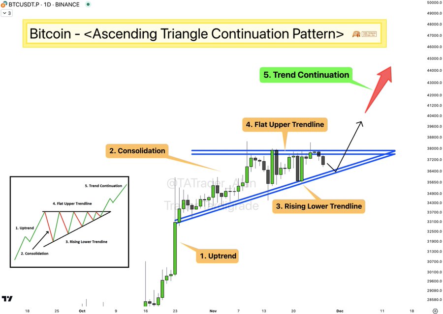 Kürzlich, am 28. November, stellte der Krypto-Marktanalyst fest, dass Bitcoin auf seinem Tages-Chart ein aufsteigendes Dreiecksfortsetzungsmuster gebildet habe, was ein weiteres bullisches Chartmuster ist, das in einem Aufwärtstrend auftritt und „eine steigende Konsolidierung bestehend aus einer ansteigenden unteren Trendlinie und einer Seitwärtsbewegung“ nahelegt obere Trendlinie.“