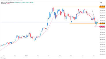 Das Hauptproblem bei Bitcoin ist, dass er zwei bärische Chart-Formationen gebildet hat. Zum einen ist es eine Doppelspitze bei 73.800 US-Dollar, mit dem untersten Punkt bei 56.550 US-Dollar. In den meisten Fällen wird dieses Muster als ein bärisches Zeichen interpretiert. Aufgrund dessen könnte der Kurs der Kryptowährung auf 44.000 US-Dollar fallen.