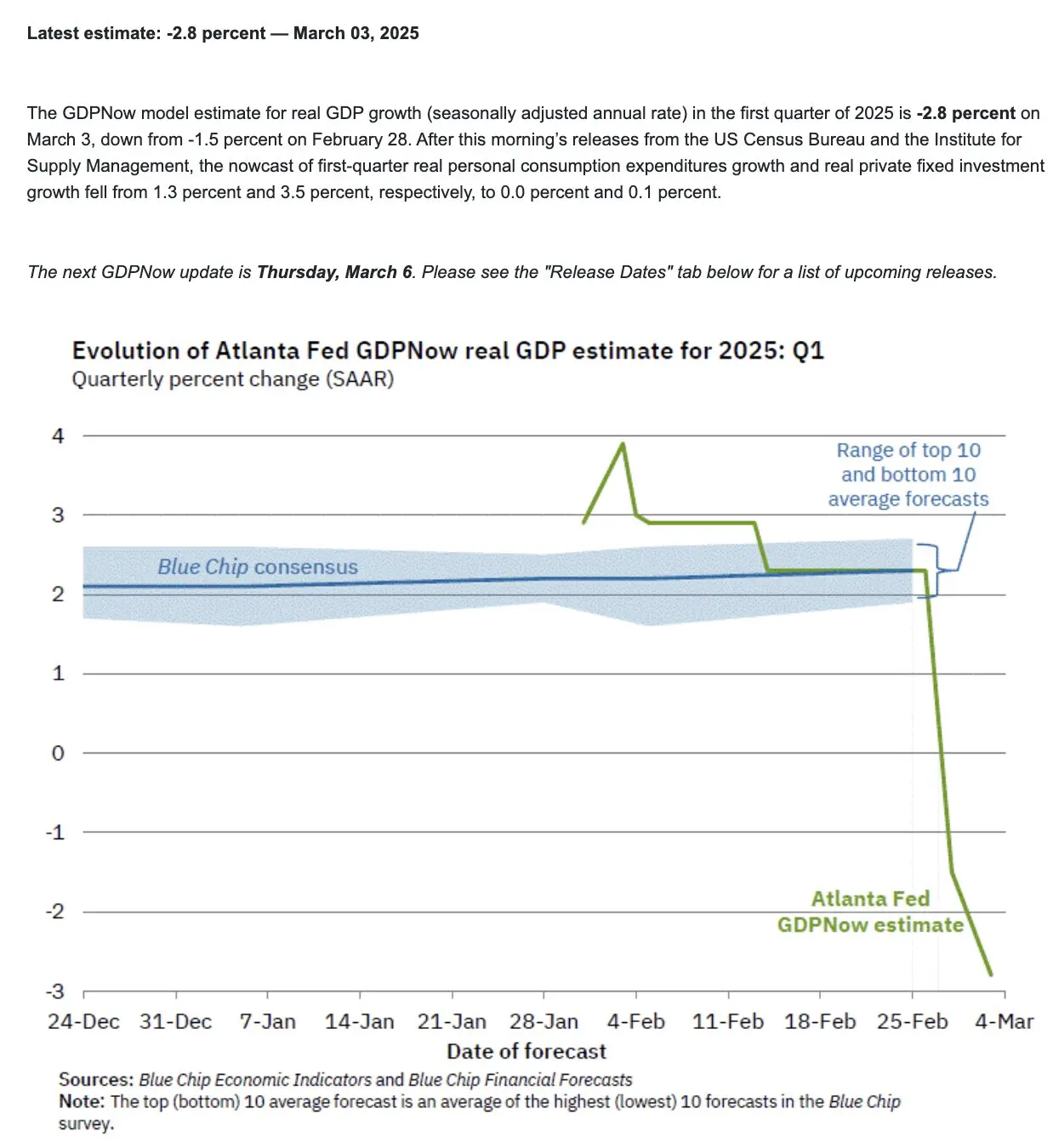 Das aktuelle GDPNow-Modell der Atlanta Fed prognostiziert eine reale BIP-Wachstumsrate von -2,8 % für das erste Quartal 2025, ein deutlicher Rückgang von -1,5 % am 28. Februar.
