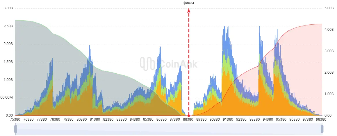 Auf der Oberseite befinden sich größere Liquiditätszonen zwischen 90.800 und 95.000 US-Dollar, während auf der Unterseite zwischen 86.400 und 77.500 US-Dollar ebenfalls bedeutende Liquiditätspools liegen.