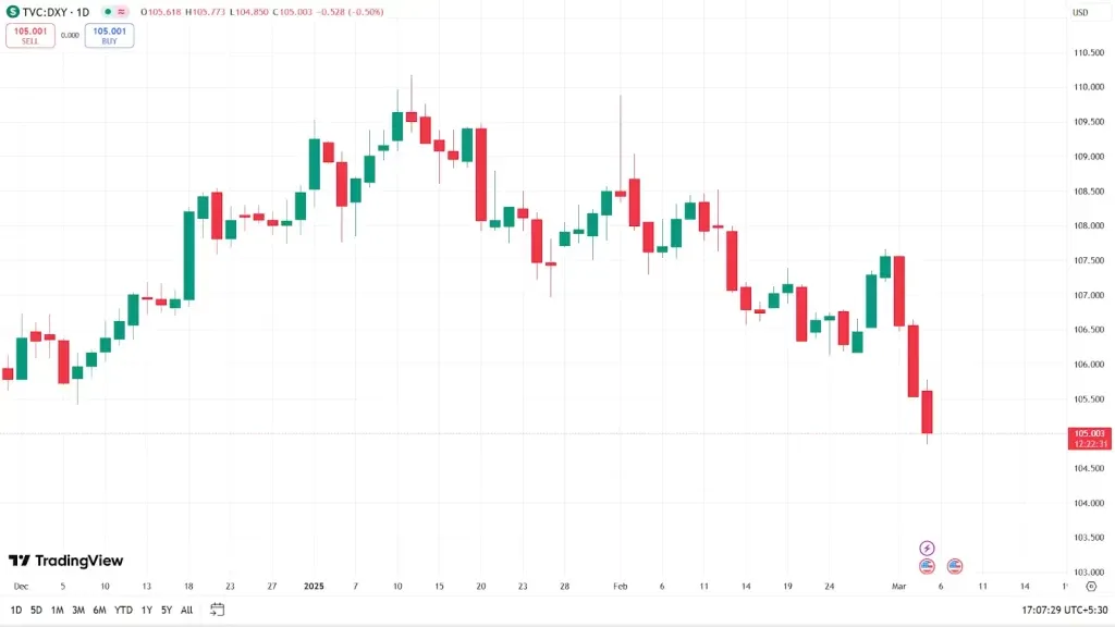 Während die Spekulationen um Trumps Handelspolitik zunehmen, zeigt sich eine weitere interessante Entwicklung: Der US-Dollar-Index (DXY) befindet sich im Rückgang. Innerhalb weniger Tage fiel er von 107 auf 105, was ein klares Zeichen für eine Abschwächung des Dollars ist.