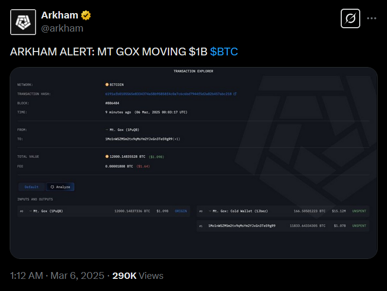 Die ehemals führende Kryptobörse Mt. Gox, die 2014 Insolvenz anmeldete, hat 12.000 Bitcoin (BTC) im Wert von über 1 Milliarde US-Dollar an eine unbekannte Wallet-Adresse transferiert.