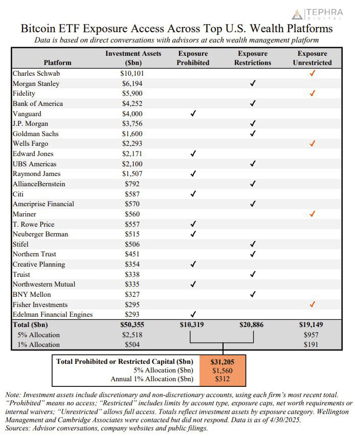 Unternehmen wie Charles Schwab, Fidelity und Wells Fargo haben die Tür weit geöffnet und bieten ein Engagement ohne Einschränkungen und verwalten 19,1 Billionen Dollar an Vermögenswerten. Allerdings sind ungefähr 20,9 Billionen Dollar mit Plattformen verbunden, die den Zugang beschränken, was Bedingungen basierend auf dem Kontotyp, den Engagementlimits oder der Investoreignung einschließt. Weitere 10,3 Billionen Dollar sind komplett vom ETF-Zugang abgeschnitten, wobei Plattformen wie Vanguard, Edward Jones und Citi weiterhin jegliche Exponierung gegenüber Bitcoin-ETFs verbieten.