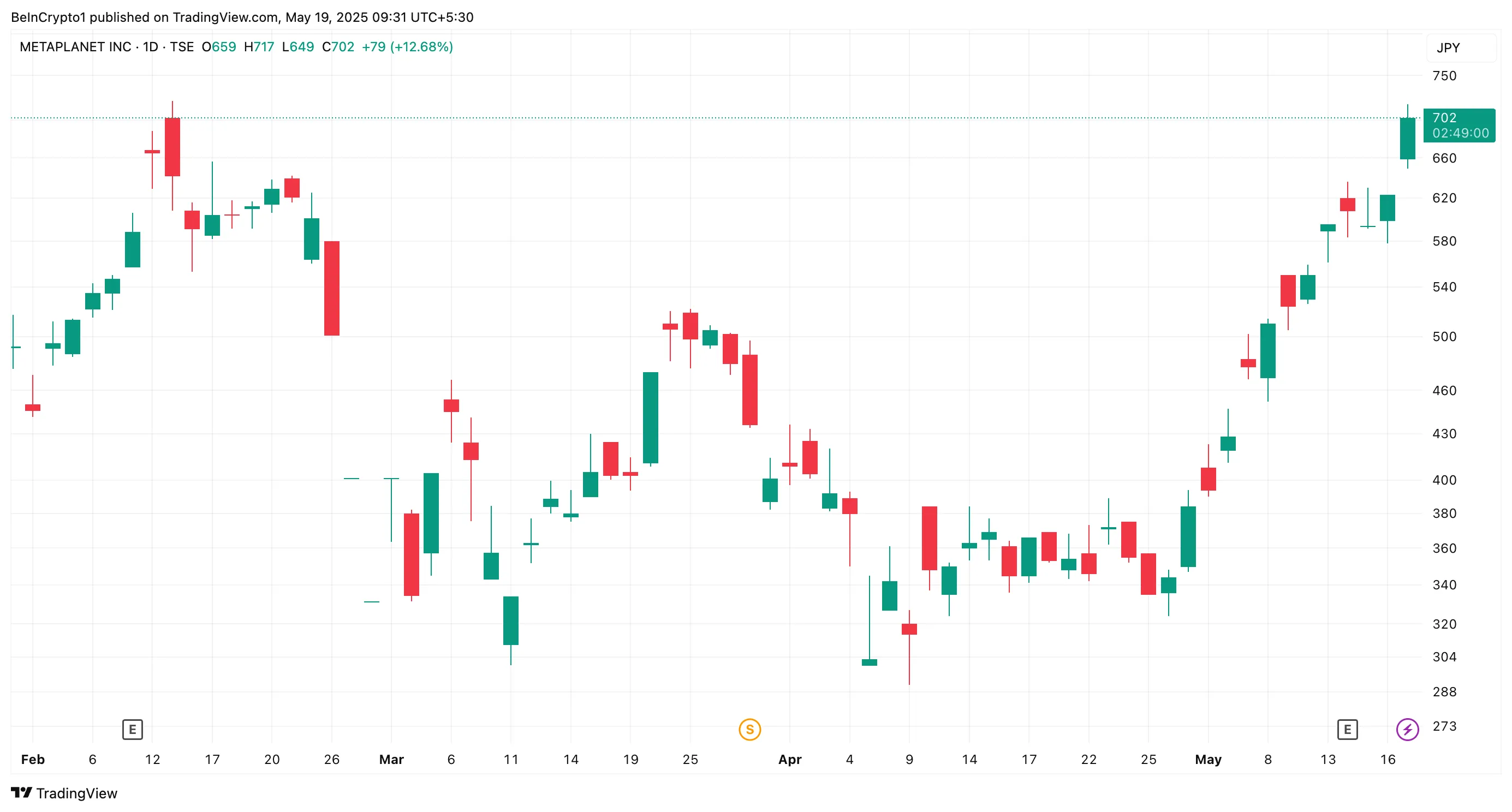 In der Zwischenzeit stieg die Metaplanet-Aktie, 3350.T, nach den Nachrichten laut Yahoo Finance Daten um 12,6 Prozent. Zum Zeitpunkt der Veröffentlichung lag der Handelspreis bei 702 Yen (4,8 USD), was Höchststände markiert, die zuletzt am 13. Februar gesehen wurden.