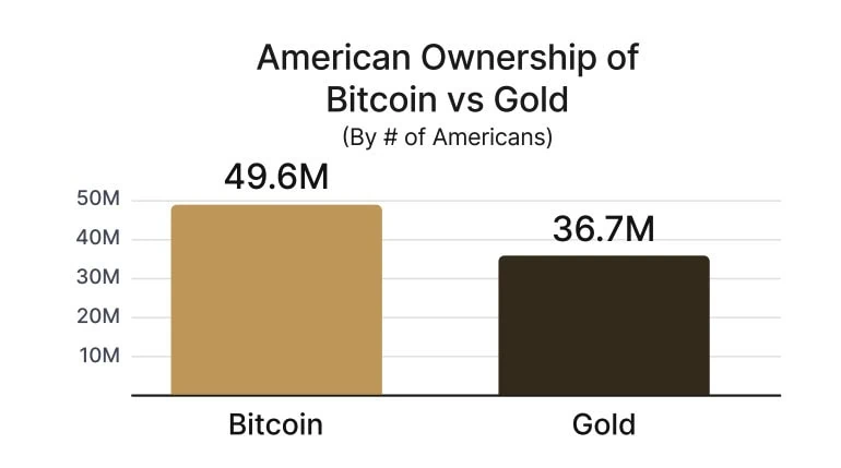 - Demnach besitzen 49,6 Millionen Menschen in den USA Bitcoin, während 36,7 Millionen Gold besitzen.
