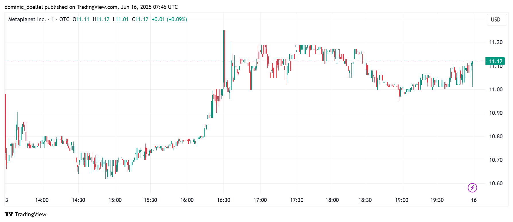 - Der neue Bitcoin-Kauf ließ den Aktienkurs von Metaplanet um knapp vier Prozent steigen.