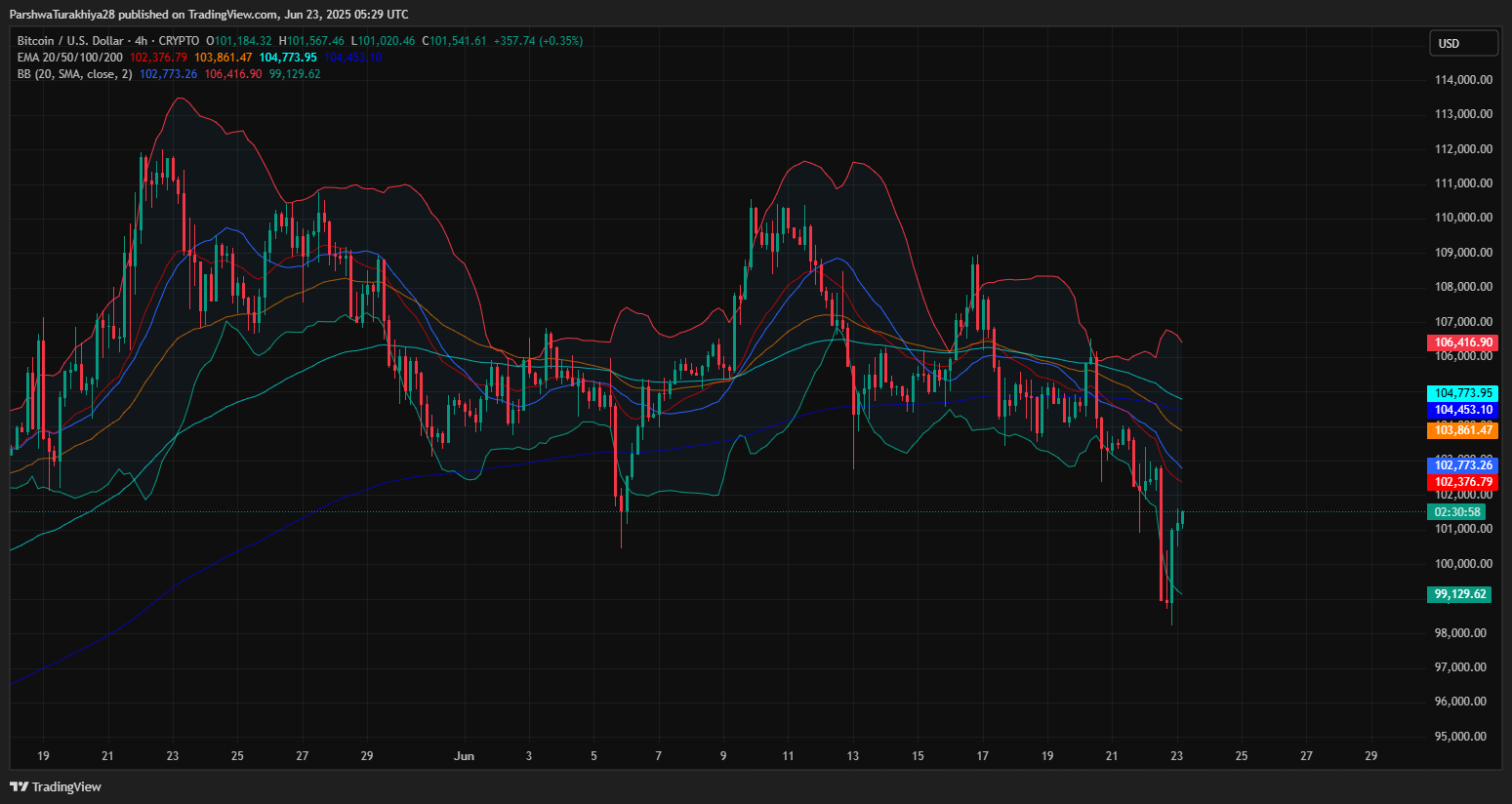 BTC verzeichnete eine starke Intraday-Rallye von einem Tief von 98.600 $ zurück auf über 101.000 $ und hinterließ auf dem 4-Stunden-Chart eine bullische Engulfing-Struktur. Diese Bewegung erfolgte genau zu dem Zeitpunkt, als Bitcoin das untere Bollinger-Band und die Kanalunterstützung auf dem täglichen Zeitrahmen berührte.
