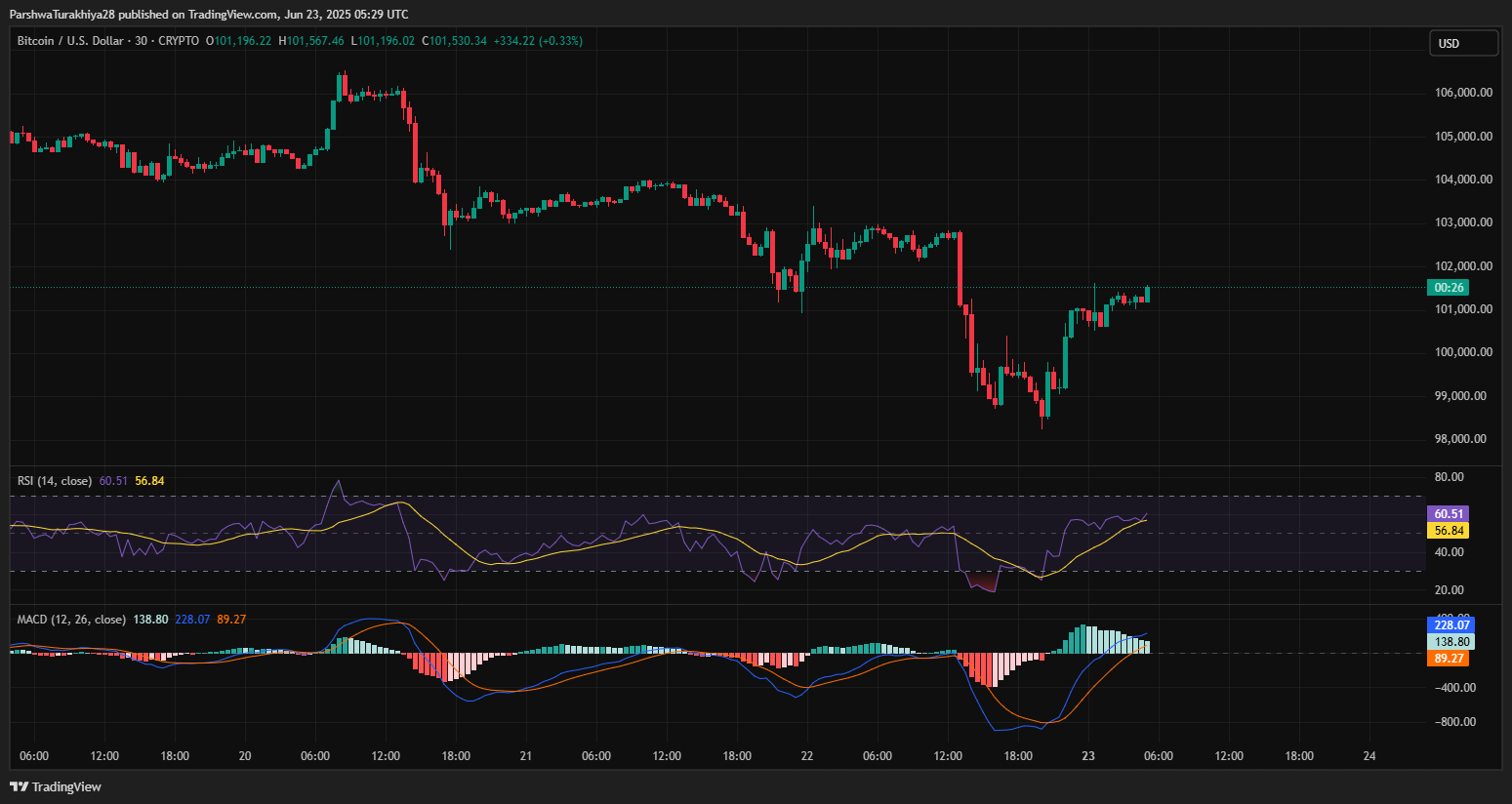 Die starke BTC-Erholung scheint durch kurzfristige überverkaufte Bedingungen und technische Unterstützung in der Nähe der 99.000 $-Marke angeheizt zu werden. Das MACD-Histogramm drehte zum ersten Mal seit dem 20. Juni ins Plus, und der RSI eroberte die Schwelle von 50 zurück.