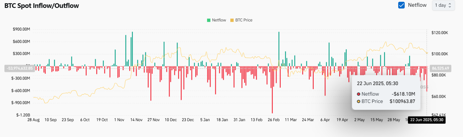 Bemerkenswert ist, dass die On-Chain-Zuflüsse trotz des Aufschwungs nach wie vor stark rückläufig sind. Den neuesten Daten zufolge lag der Bitcoin-Nettofluss am 22. Juni bei -618,10 Millionen, was auf einen anhaltenden Verkaufsdruck an den Spotbörsen hindeutet.