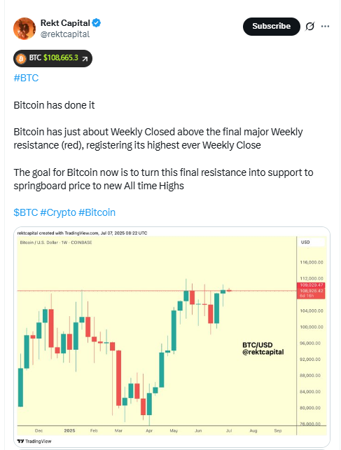 #Bitcoin highest weekly close in history $109,200 🔥 pic.twitter.com/ojA0YpoZRD