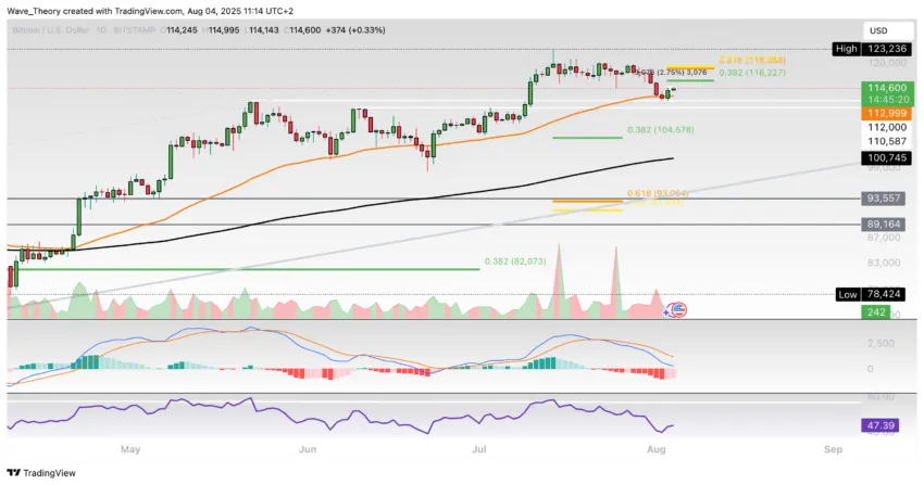 Der Bitcoin Kurs ist zum 50-Tage-EMA bei rund 113.000 USD korrigiert