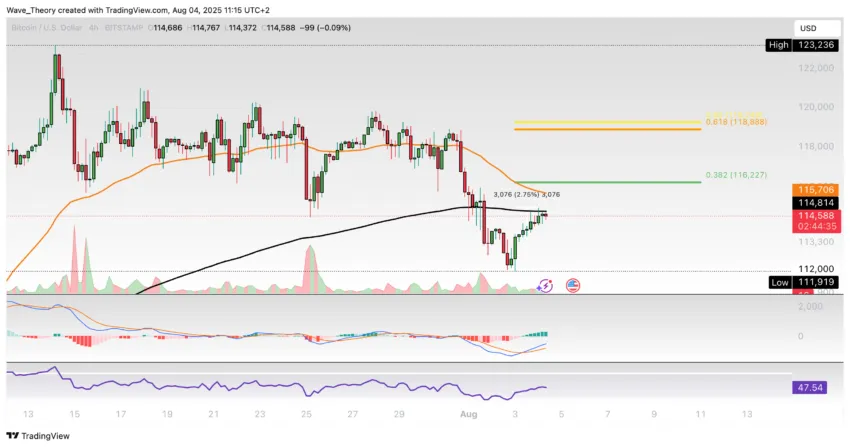 Trotz der bullischen Aussichten stößt Bitcoin jetzt am 200-4H-EMA bei rund 114.815 USD auf signifikanten Widerstand, woran der Kurs bärisch abgewiesen werden könnte. Bricht er den Widerstand hingegen bullisch, könnte er zu den Fib Widerständen steigen.
