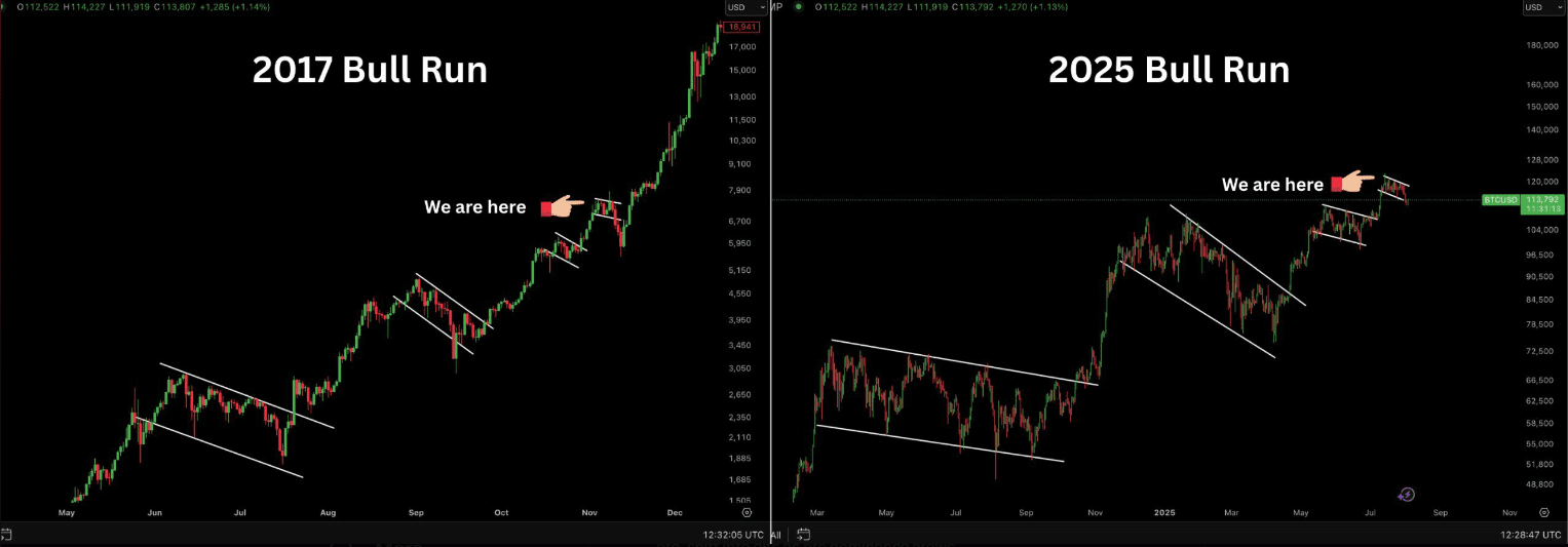 Analyst AshCrypto teilt auf X eine Vergleichsgrafik zwischen 2017 – als Bitcoin stark stieg – und der aktuellen Kursentwicklung.