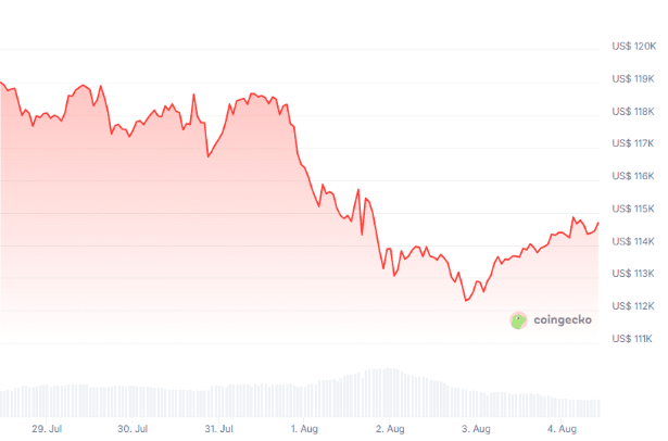 Der BTC-Kurs fiel in der vergangenen Woche um 3,6 % auf 114.678 US-Dollar.