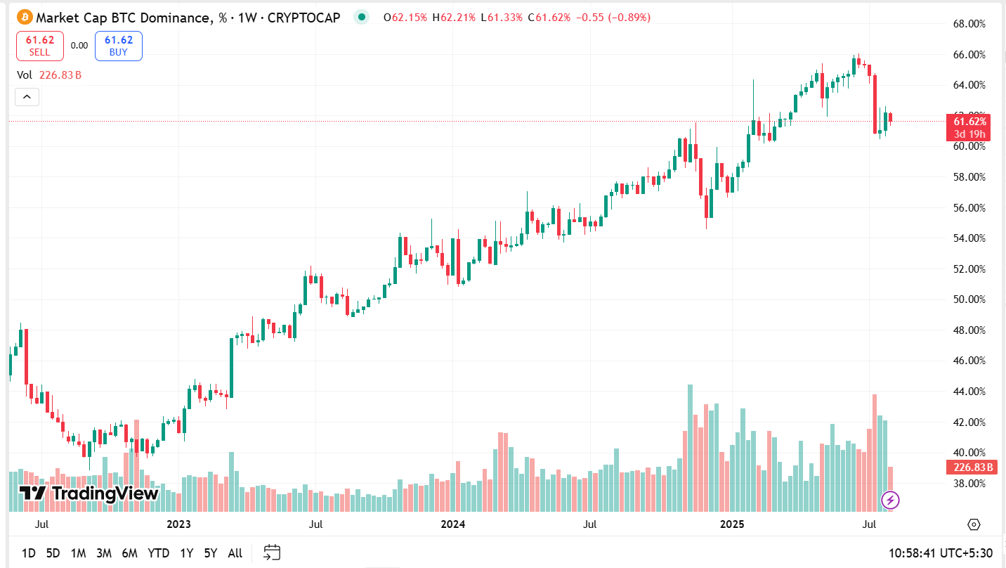 - Bitcoin Dominance testet seinen gleitenden 50-Wochen-Durchschnitt, ein Schlüsselniveau für den Altcoin-Markt