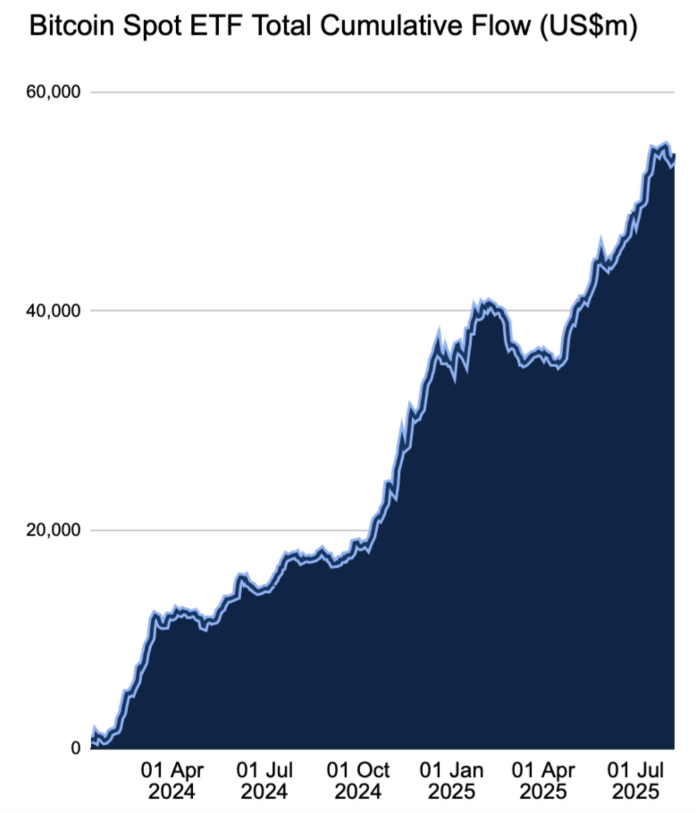 Seit der Zulassung im Januar 2024 konnten die US-amerikanischen Bitcoin-Spot-ETFs 54,4 Milliarden US-Dollar an kumulierten Nettozuflüssen verzeichnen – knapp 20 Milliarden davon allein in diesem Jahr.