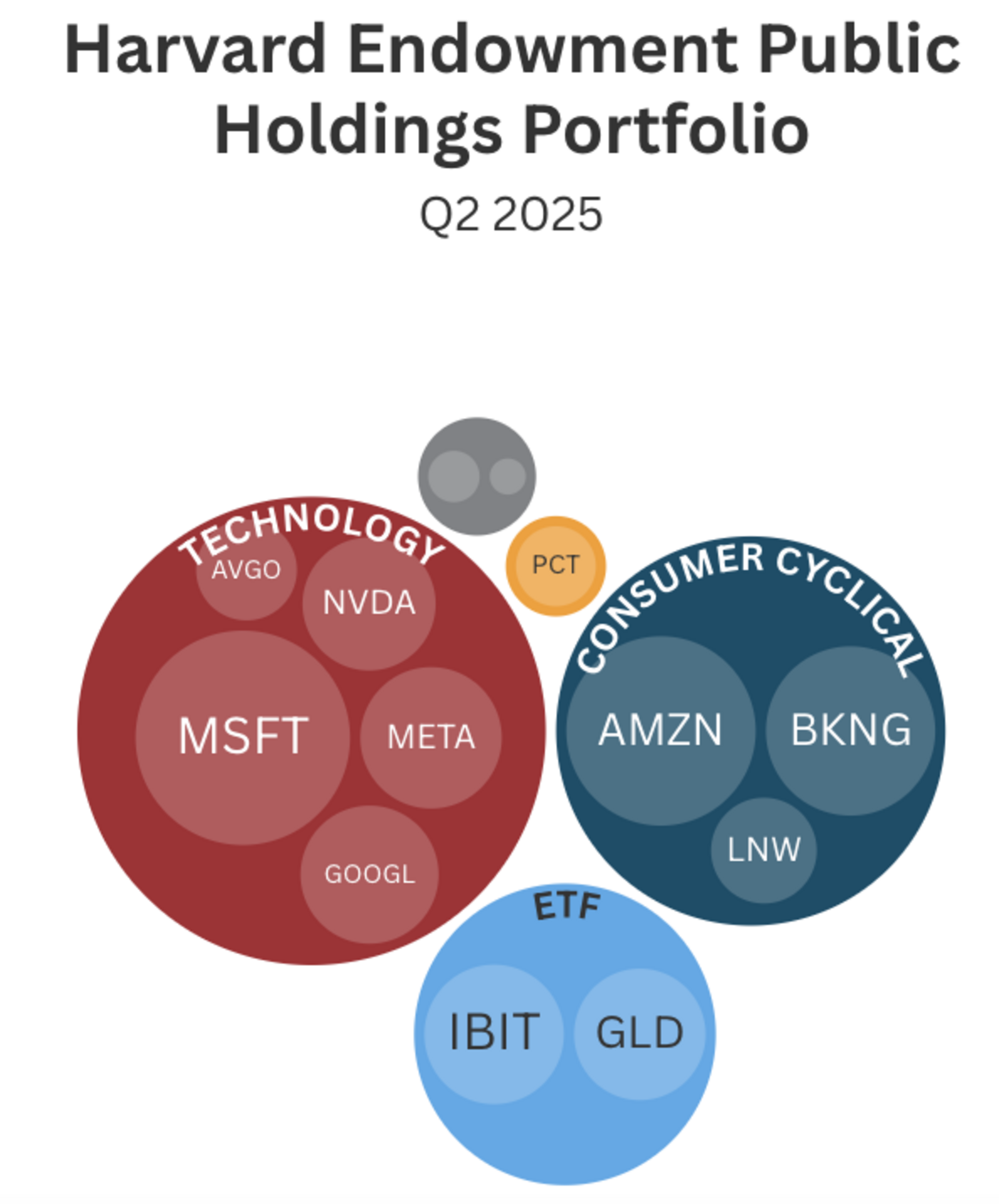 In dem öffentlichen einsehbaren Teil des Harvard-Portfolios, das mehr als 1 Milliarde US-Dollar an Wertpapieren beinhaltet, entfallen rund 8 Prozent auf Bitcoin. Harvard hält sogar mehr Bitcoin als Gold.