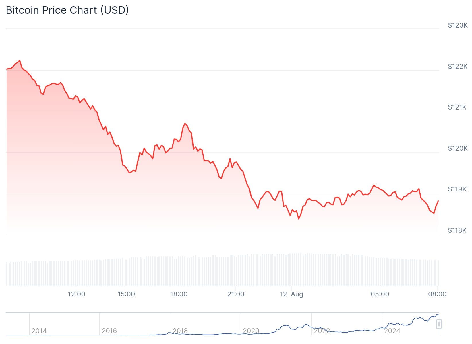 Am Morgen verharrte der Kurs knapp unter 122.000 US-Dollar. Im Tagesverlauf entfernte er sich zunehmend. Gegen 15:00 Uhr fiel er unter 120.000 US-Dollar und spät am Abend verlor er auch die 119.000 US-Dollar.