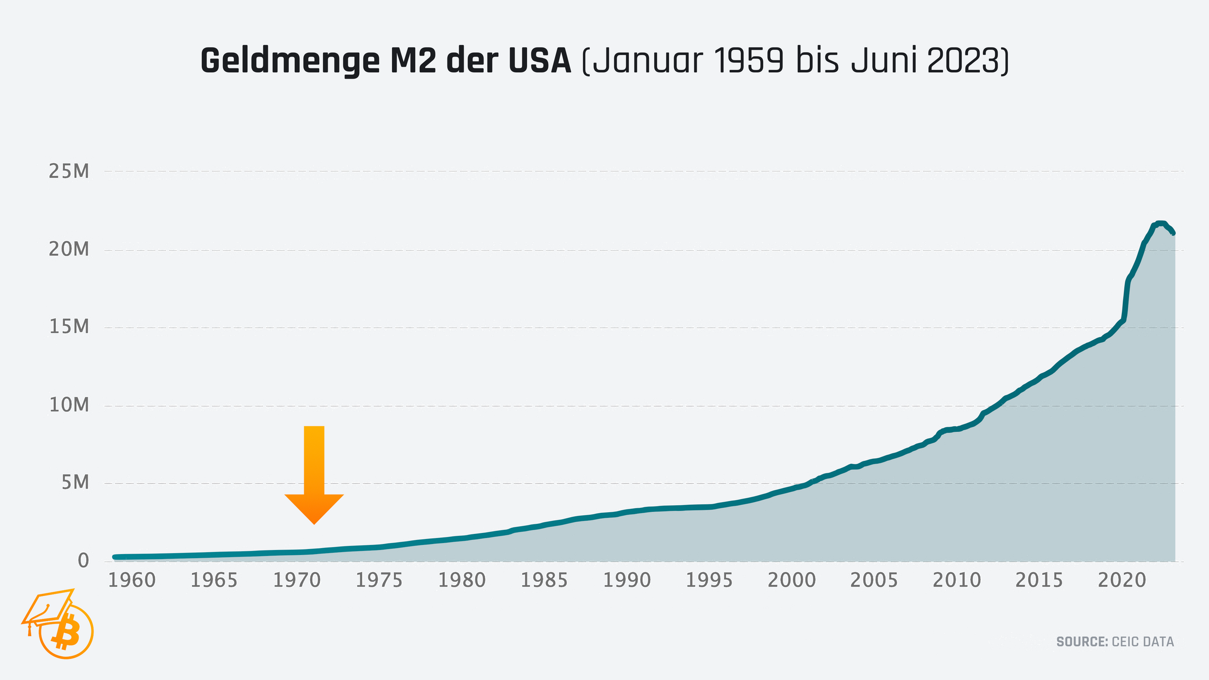 Während des Bretton-Woods-Systems war jedoch bei Weitem nicht alles perfekt. Trotz Goldstandard stieg die umlaufende US-Dollar-Geldmenge kontinuierlich an – wenn auch langsamer als in dem aktuell vorherrschenden Fiatgeldsystem. Das große Problem war jedoch, dass die Menschen nicht mit Gold an sich handelten, sondern mit US-Dollar, die letztlich nur einen indirekten Anspruch auf Gold darstellten.