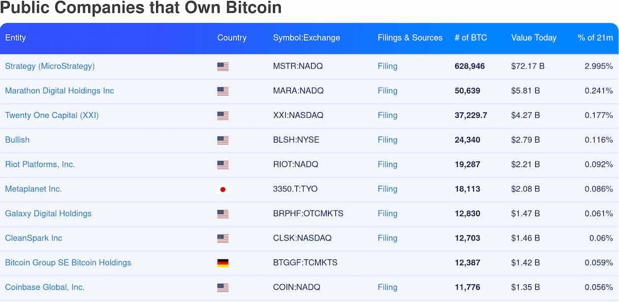 Bitcoins Maximalversorgung liegt bei 21 Millionen. Ein Prozent davon entspricht ganzen 210.000 $BTC, die aktuell über einen Marktwert von 24 Milliarden US-Dollar verfügen. Derzeit übertrifft nur Strategy diesen Wert mit einem Vermögen von 629.000 Bitcoin.