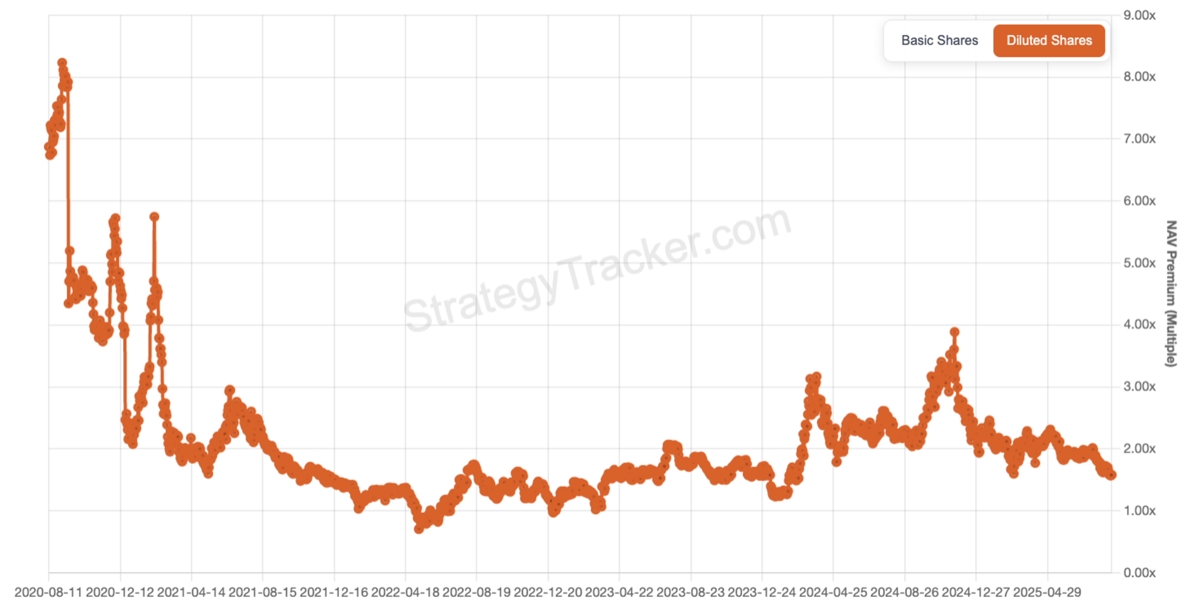Obwohl das mNAV zu diesem Zeitpunkt schon unter 2 x lag und einige Marktbeobachter die Ausgabe neuer Aktien für die vermeintlich schlechte Performance der MSTR-Aktie verantwortlich machten, ist der Wert seither weiter gefallen – auf circa 1,6 x.