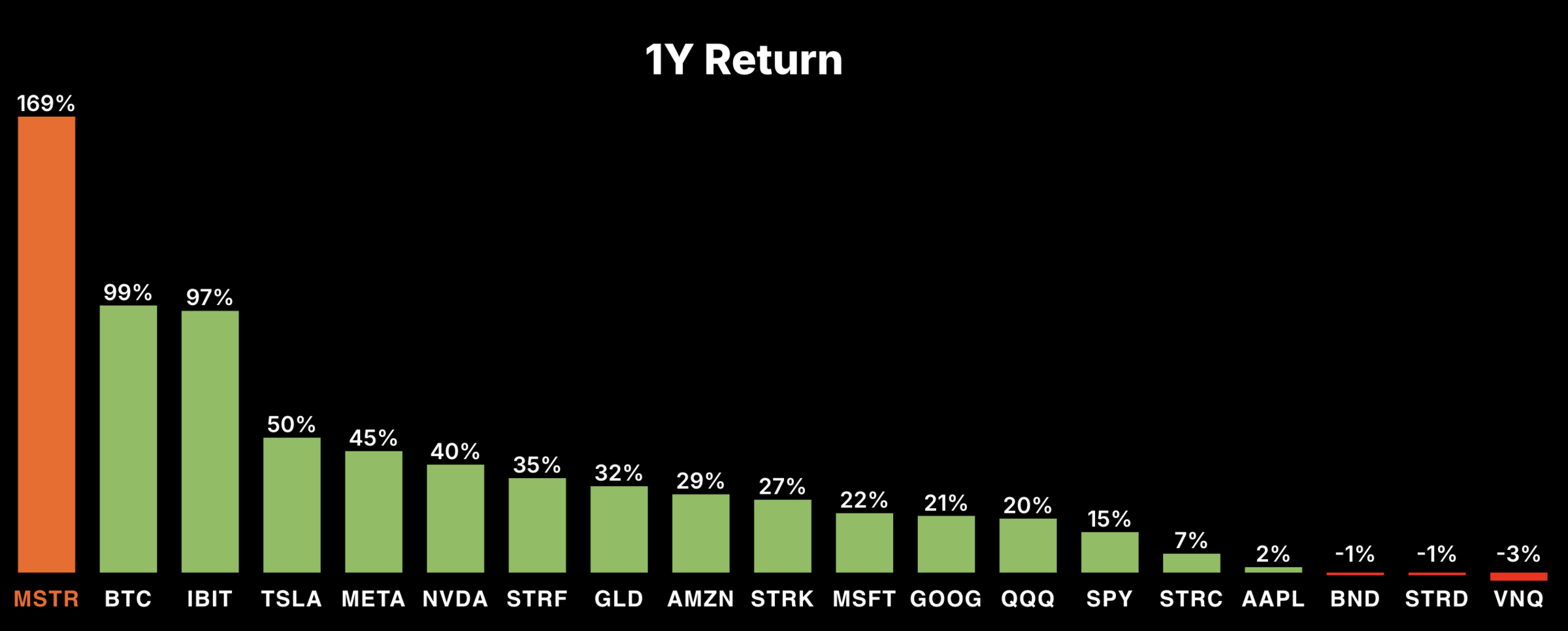 Trotz des eher schwachen Kursverlaufs in der jüngsten Vergangenheit ist und bleibt Strategy aber eine Erfolgsgeschichte. Seit Beginn der Bitcoin-Strategie ist die Aktie um sage und schreibe fast 3.000 Prozent gestiegen. In den letzten 12 Monaten ist MSTR immer noch 169 Prozent im Plus, während $BTC sich „nur“ verdoppelte.