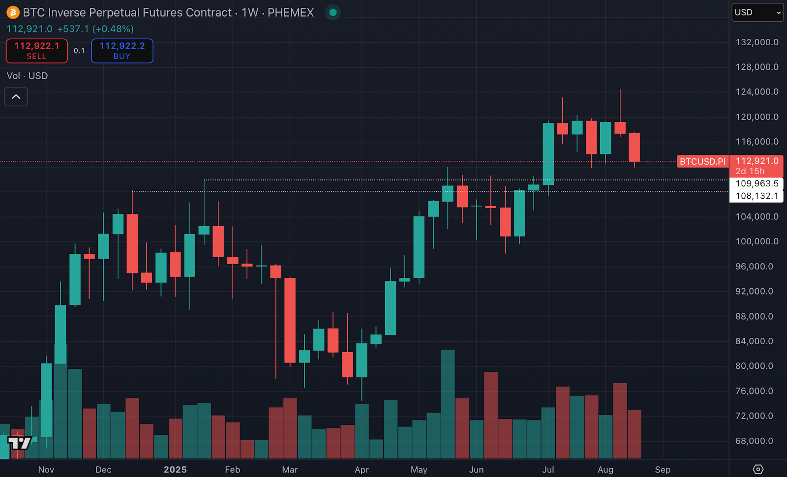 Auf dem wöchentlichen Diagramm unten bekommen wir etwas mehr Klarheit. Hier sehen wir auch, dass die zwei Ausschläge über das Niveau von 120.000 Dollar deutliche Wicks von wöchentlichen Kerzen waren. Daher sind diese Ausschläge niveau-technisch nicht sehr relevant. 120.000 Dollar ist und bleibt eine klare Barriere, über der wir einen wöchentlichen Abschluss sehen möchten.