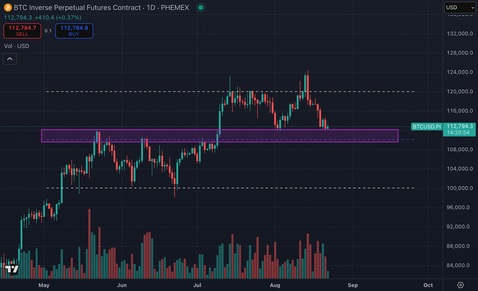 Danach fiel der Kurs zurück zur Unterstützungszone (lila) um den Mittelpunkt des Kanals, zwischen etwa 112.000 und 109.000 Dollar. Auffällig ist, dass BTC das letzte Mal, als es diese Zone berührte – kurz vor dem Allzeithoch – sofort kräftig anstieg. Jetzt bleibt diese Reaktion aus. Der Kurs wirkt schwächer, und gestern erschien sogar eine bearish engulfing Kerze. Das ist technisch gesehen ein negatives Signal.