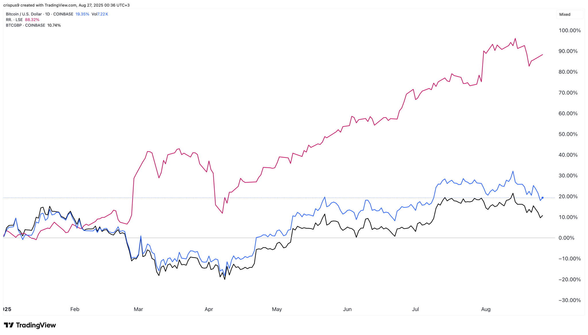 Der gleiche Trend ist in diesem Jahr zu beobachten: Die RR-Aktie ist um 82% gestiegen, während Bitcoin um 9,7% in Pfund Sterling und 20% in US-Dollar zugelegt hat.