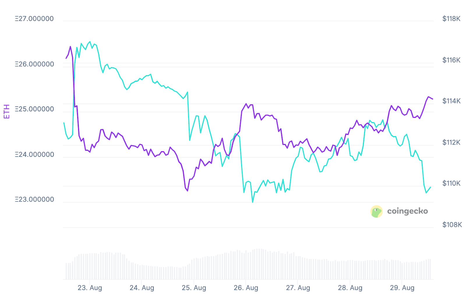 Wochenchart Bitcoin-Kurs (türkis) und BTC/ETH-Verhältnis (lila) – Quelle: CoinGecko