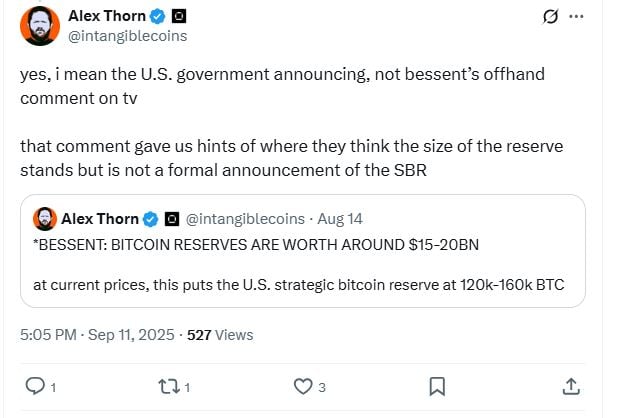 Thorn stellte weiter fest, dass der Markt die Möglichkeit einer solchen Ankündigung völlig unterschätzt. Er sieht eine mögliche Reserve von 15 bis 20 Milliarden Dollar, was beim heutigen Kursniveau etwa 120.000-160.000 Bitcoin entspricht.