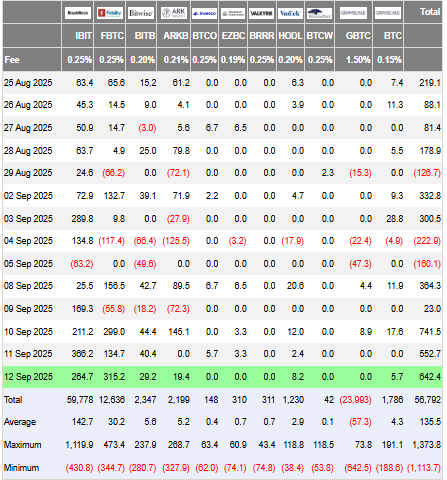 Die Zuflüsse in BTC-ETFs haben sich wieder beschleunigt, alleinam 12. Septemberflossen 642 Millionen Dollar zu. Es war der höchste Anstieg an einem einzelnen Wochentag, und er ließ die ETF-Zuflüsse der Woche insgesamt auf über 2,3 Mrd Dollar steigen. der Grund dürfte die Erwartung der Anleger einer in der kommenden Woche erwarteten Senkung der Leitzinsen sein.