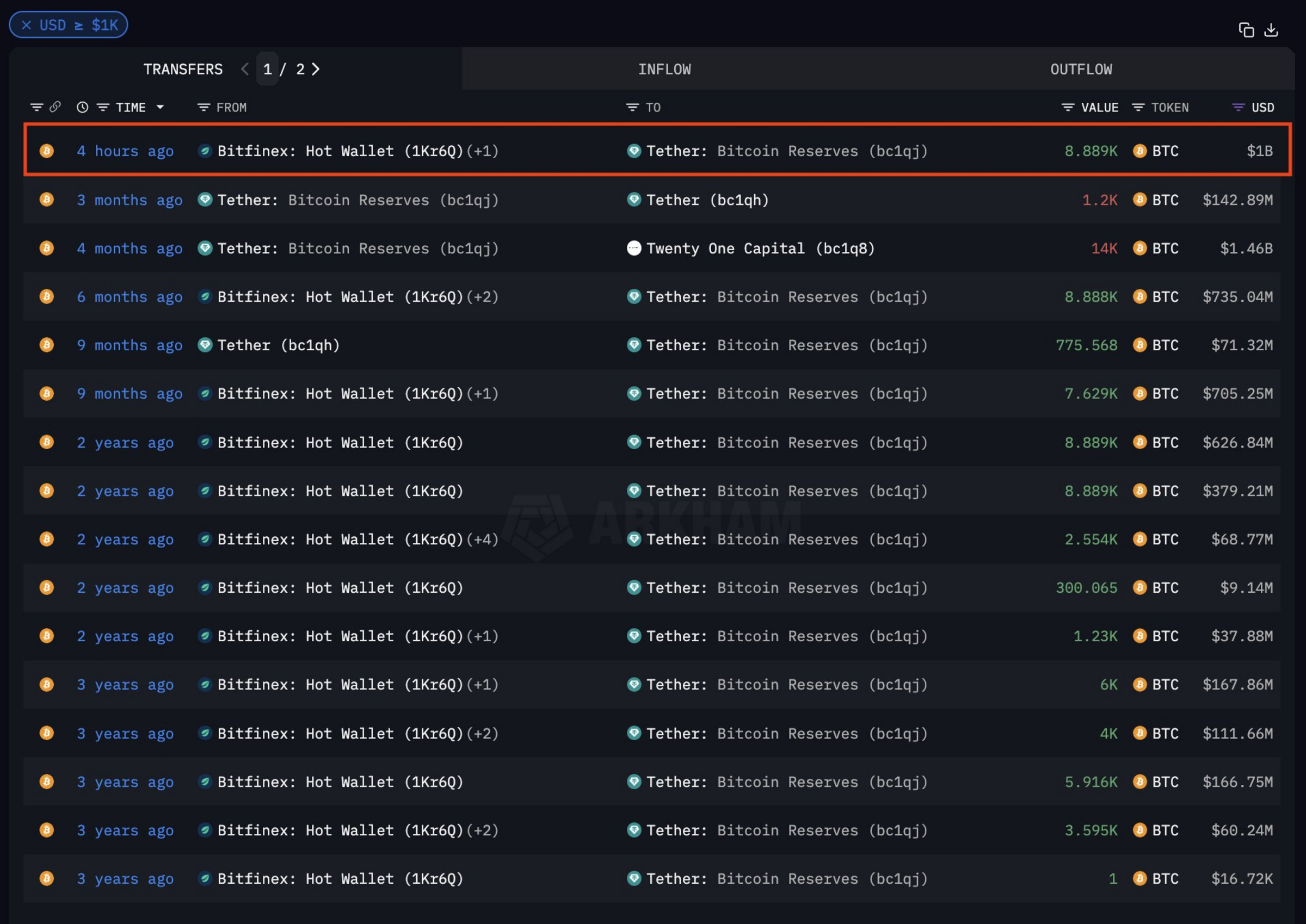 Tether, das Unternehmen hinter dem Stablecoin USDt, hat die eigene Bitcoin-Reserve vergrößert. Die öffentlich einsehbare Wallet verzeichnete am Dienstag einen Zufluss von 8.888 BTC im Gegenwert von circa 1 Milliarde US-Dollar.