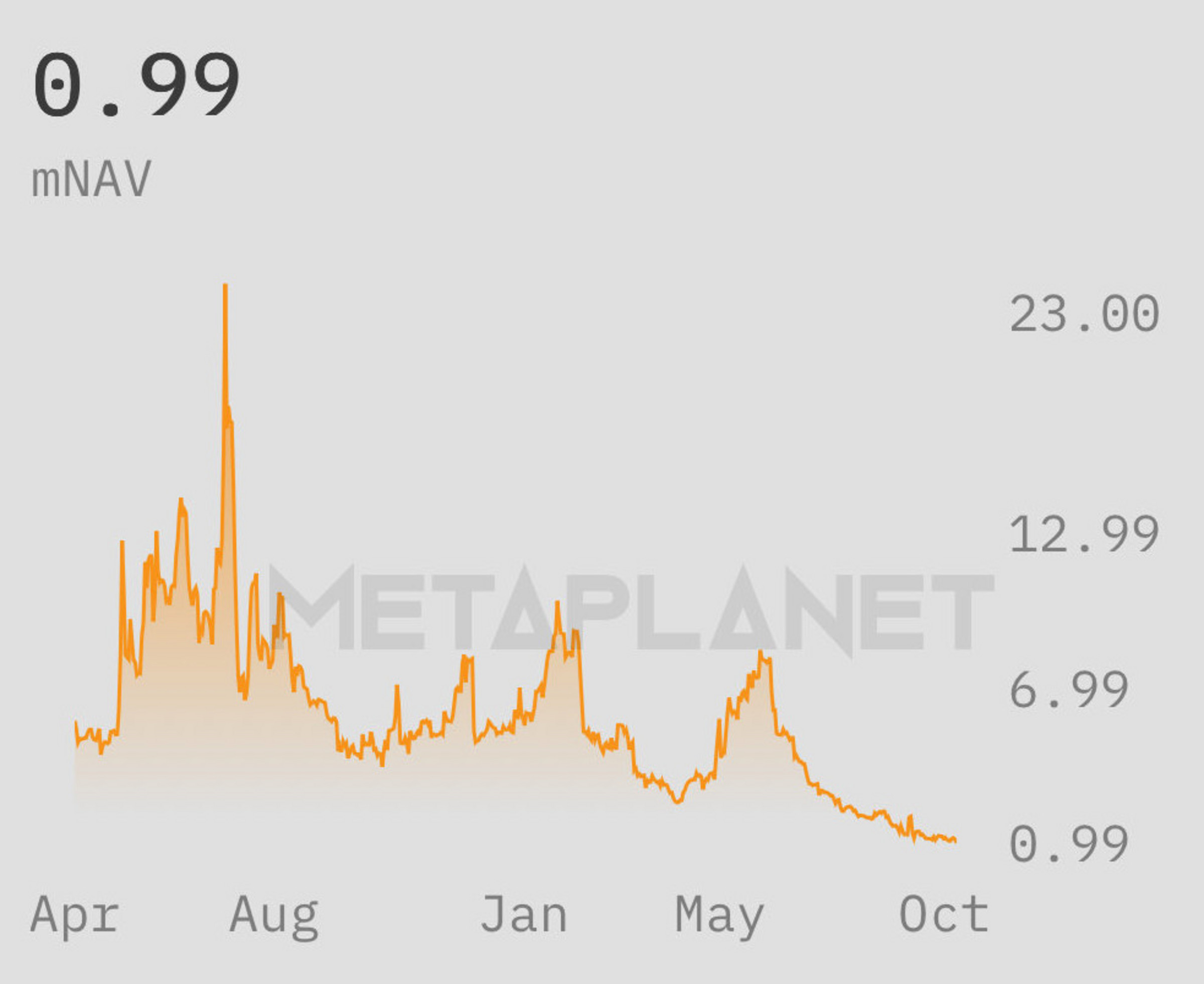 Am 22. Mai kostete eine Metaplanet-Aktie 21 Euro. Heute sind es nur noch rund 2,60 Euro, also fast 90 % weniger. Im Rahmen dieses Kursrutsches ist das mNAV jetzt erstmals unter den Wert von 1 x gefallen.