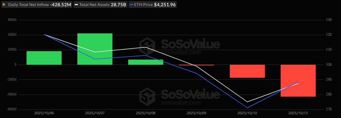Ether ETFs erlitten einen größeren Schlag und verzeichneten Abflüsse in Höhe von 428,52 Millionen Dollar über sieben Fonds. Blackrocks ETHA traf es am härtesten mit einem massiven Abgang von 310,13 Millionen Dollar, gefolgt von Grayscales Ether Mini Trust mit 49,67 Millionen Dollar und ETHE mit 20,99 Millionen Dollar.