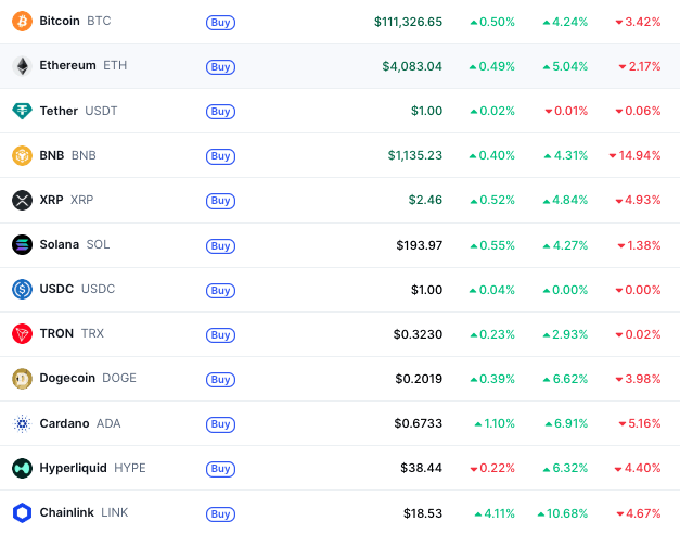 Aber zuerst zur Marktentwicklung: Bitcoin hat sich seit dem Freitag über das Wochenende stark erholt und wird nun wieder bei mehr als 111.000 Dollar gehandelt. Aktuell sieht man auch, dass sich viele andere Krypto-Assets wie Ethereum, Dogecoin oder Chainlink deutlich erholt haben und die Verluste der vergangenen sieben Tage wieder fast wettgemacht haben: